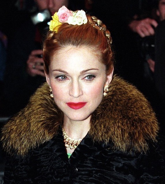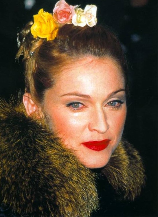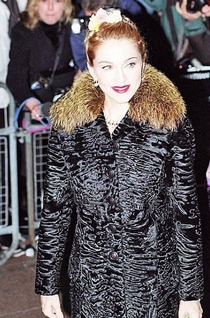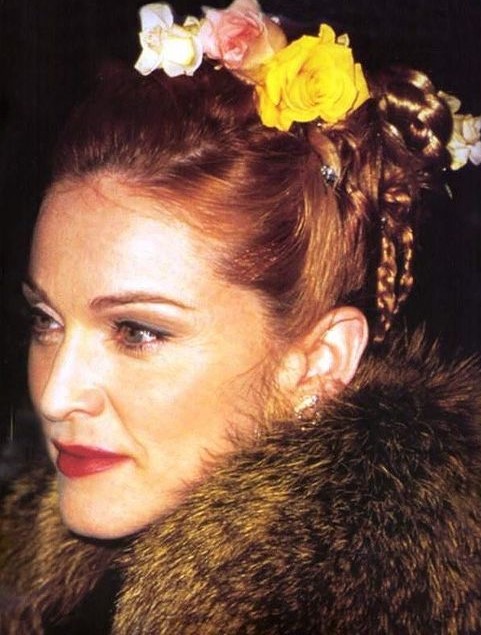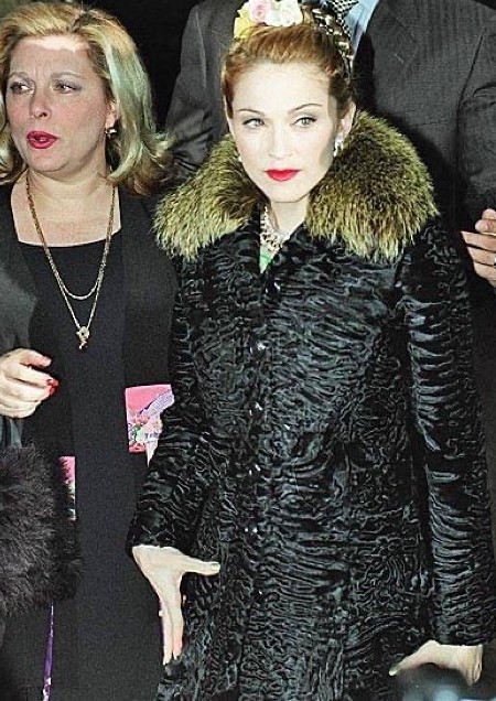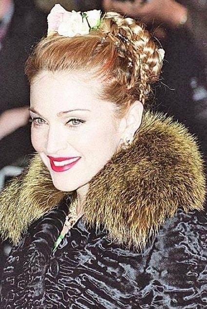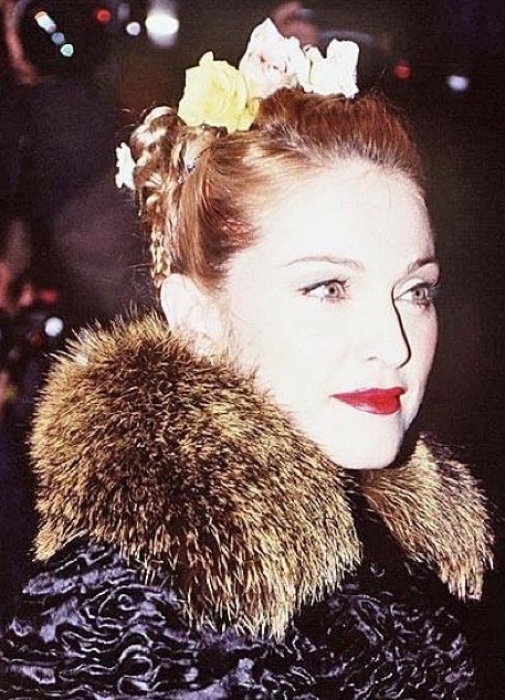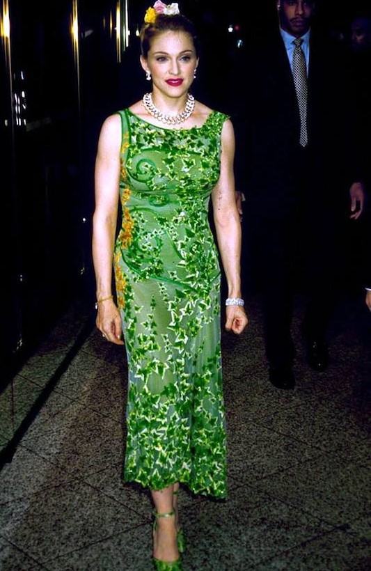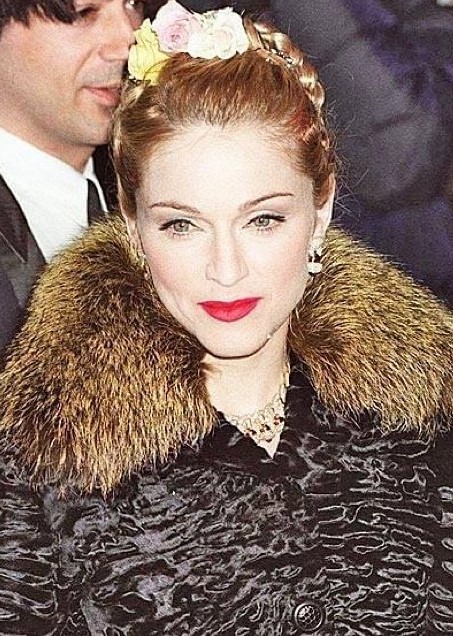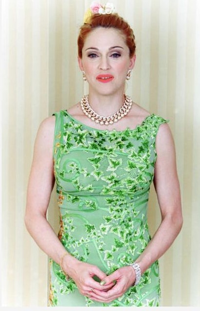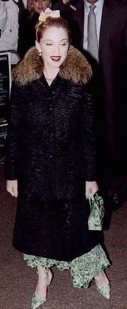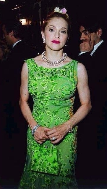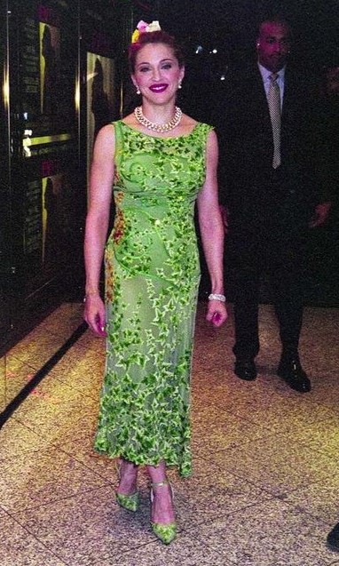 Madonna lució un vestido verde con diseño de flores de Versace, un tapado largo con cuello de piel de Dolce & Gabbana; cabello recogido con varias trenzas y rodete estilo Evita a cargo de Luigi Murenu y maquillaje por Sarah Monzani.