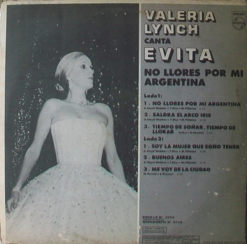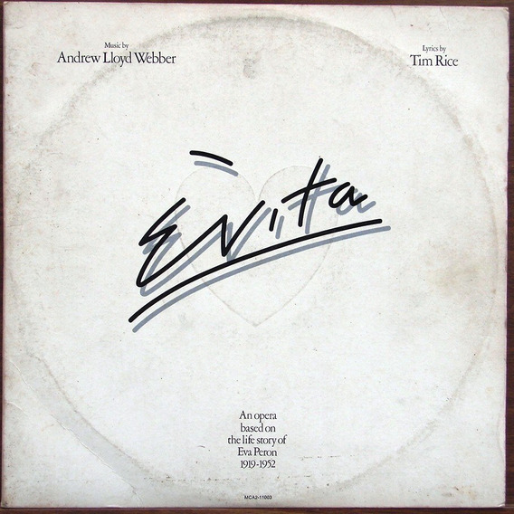 Tim Rice comienza a interesarse en la vida de Eva Perón luego de haber visto el film «Reina de Corazones» del director argentino Carlos Pasini Hansen y haber escuchado un programa en la radio acerca de la primera dama. Incluso viajó a Argentina para recabar información sobre el personaje y su fascinación comenzó a crecer hasta llegar a ponerle el nombre Eva a una de sus hijas. Se comenzó a gestar la idea de realizar un musical con aires latinos en base a la vida de Eva Perón con Andrew Lloyd Weber pero este estaba realizando el musical «Jeeves» con Alan Ayckbourn. Luego de varias idas y vueltas, finalmente Weber se reúne con Rice para crear el álbum conceptual «Evita». El disco conceptual «Evita» se lanzó en UK en noviembre de 1976 con un éxito impresionante y muy llamativo para un LP de este tipo sin tener una obra musical en teatro. El disco llegó a los primeros puestos junto con la canción principal «Don’t Cry for Me Argentina» interpretada por Julie Covington. «Evita» llegó a tener incluso mucho más éxito que el musical «Jesucristo Superestar» realizado meses antes. Al momento de escuchar «Evita», el primer interesado en realizar una versión fílmica, aún sin haber sido estrenada en teatro fue Alan Parker; sin embargo no pudo continuar con su idea debido a otros proyectos.