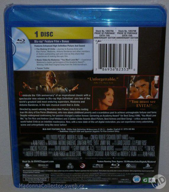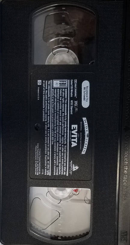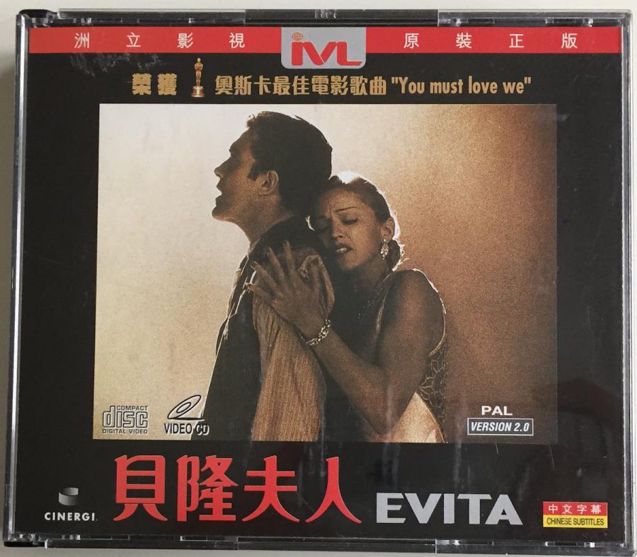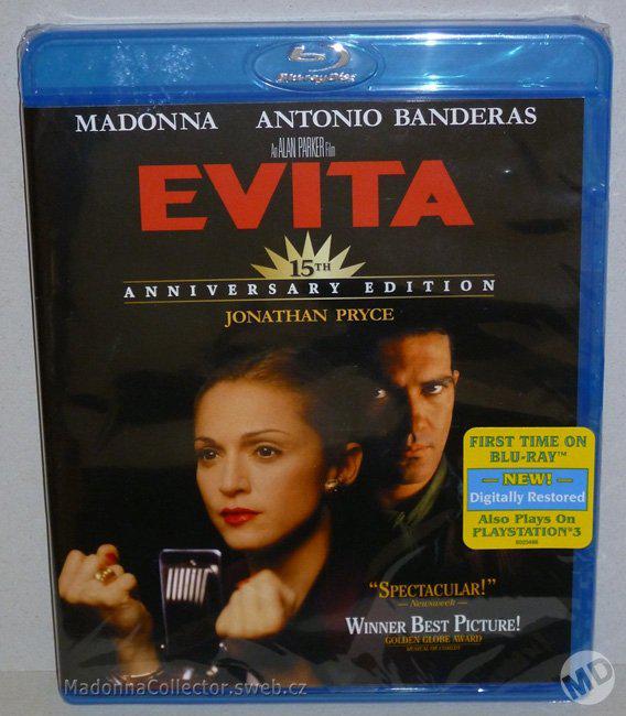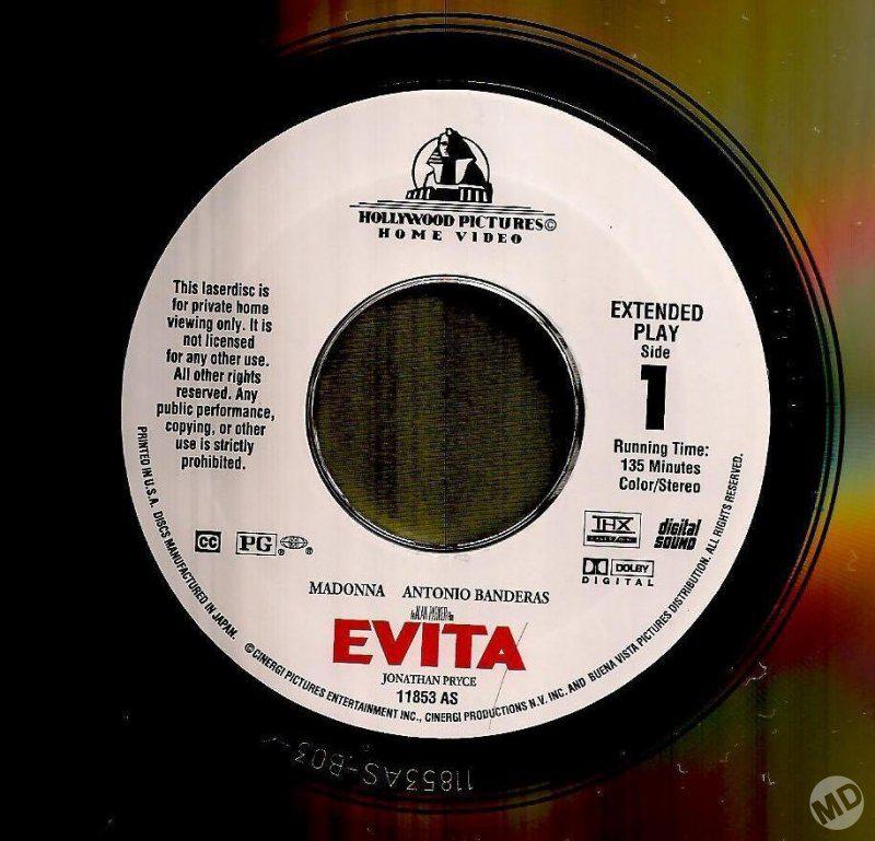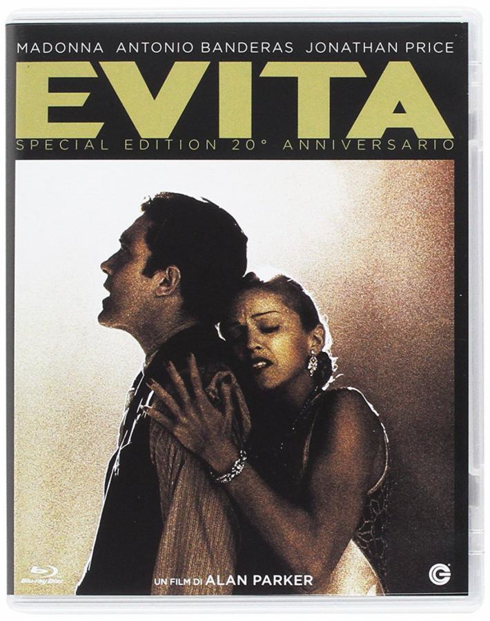 «Evita» se lanzó inicialmente en VHS y Láser Disc en agosto de 1997 a nivel mundial. Cada una de las productoras de los diferentes países modificaron el diseño de portada cambiando la imagen y la tipografía. Con respecto al Láser Disc en USA se lanzó la versión regular y la versión de lujo con una edición limitada llamada «The Criterion Collection» con 4 discos que incluía mucho material adicional como el documental del making of, comentario del director, los video de «You Must Love Me» y «Don’t Cry for Me Argneitna» y comerciales de cine y televisión. En formato DVD se lanzó en 1998 y en 2012 con motivo del 15 aniversario, se editó en formato Blu-Ray en USA, México e Italia con el mismo material adicional que el LD.
