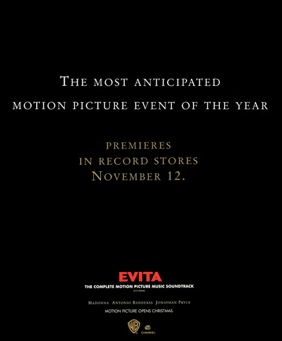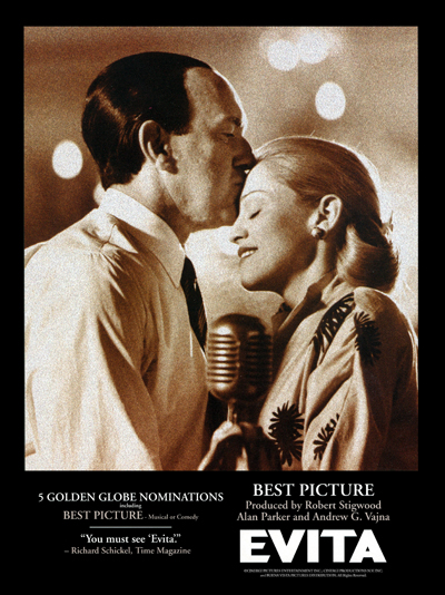 - «Evita» es una película musical basada en el disco conceptual del mismo nombre compuesto por Andrew Lloyd Weber y Tim Rice en 1972 y que luego daría lugar a la producción de la obra teatral en 1978.