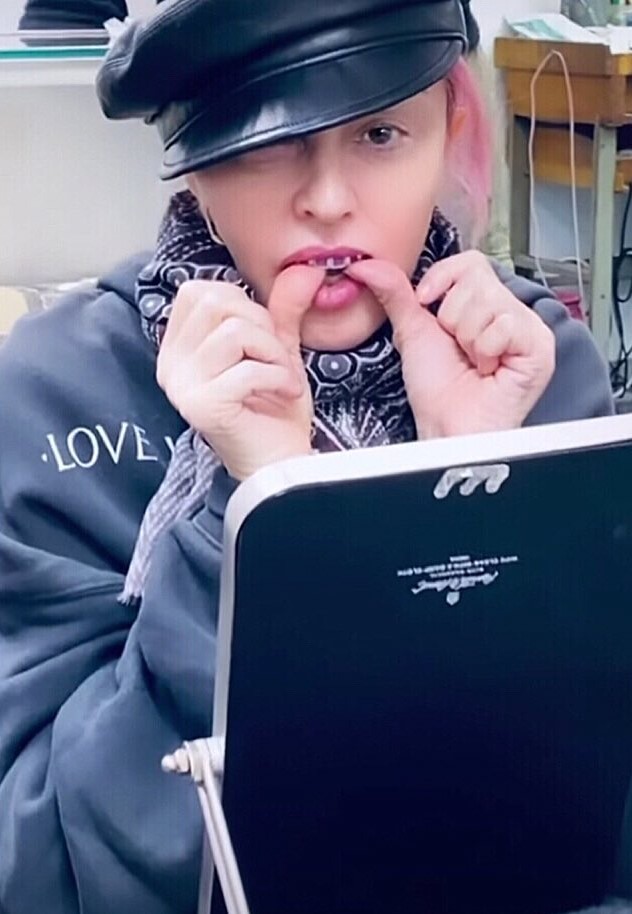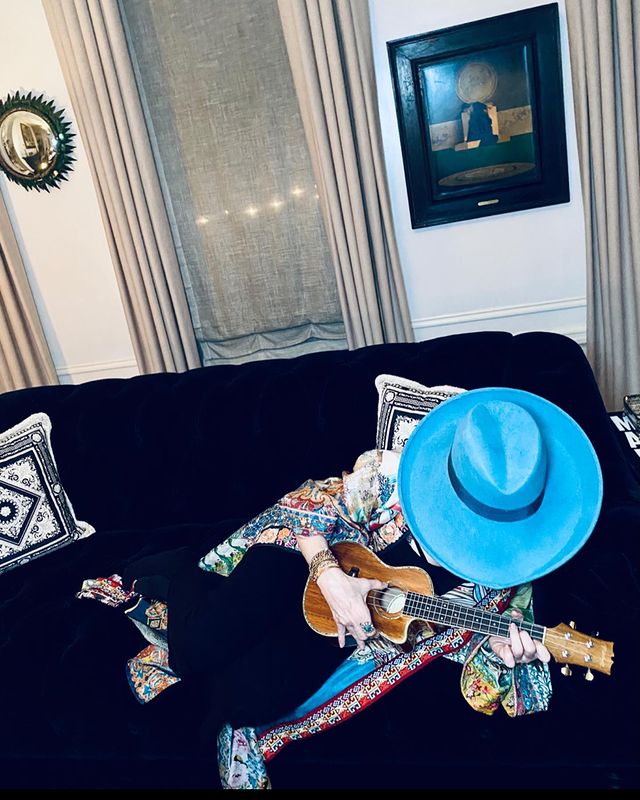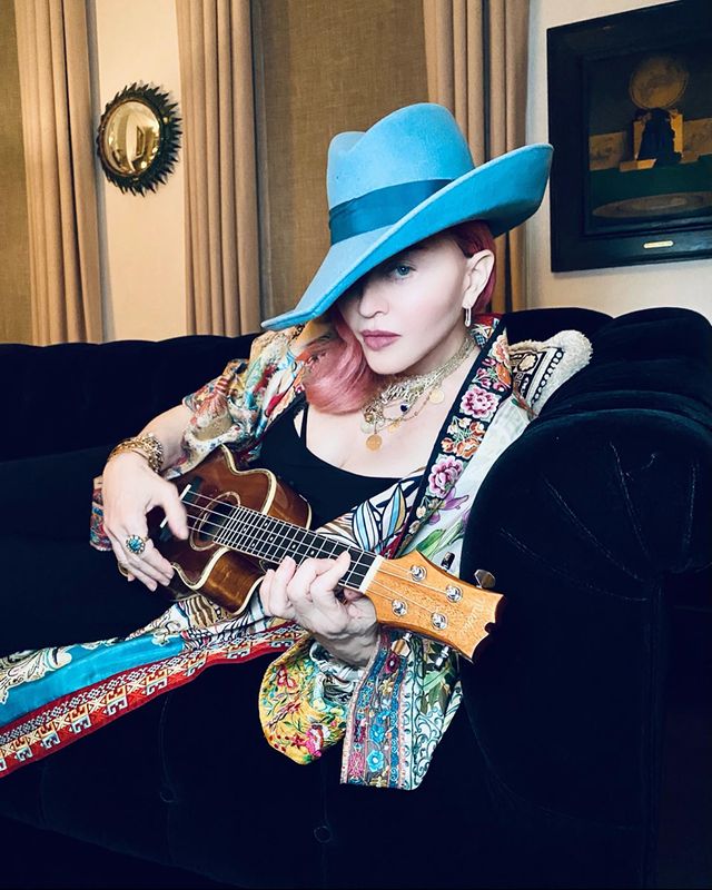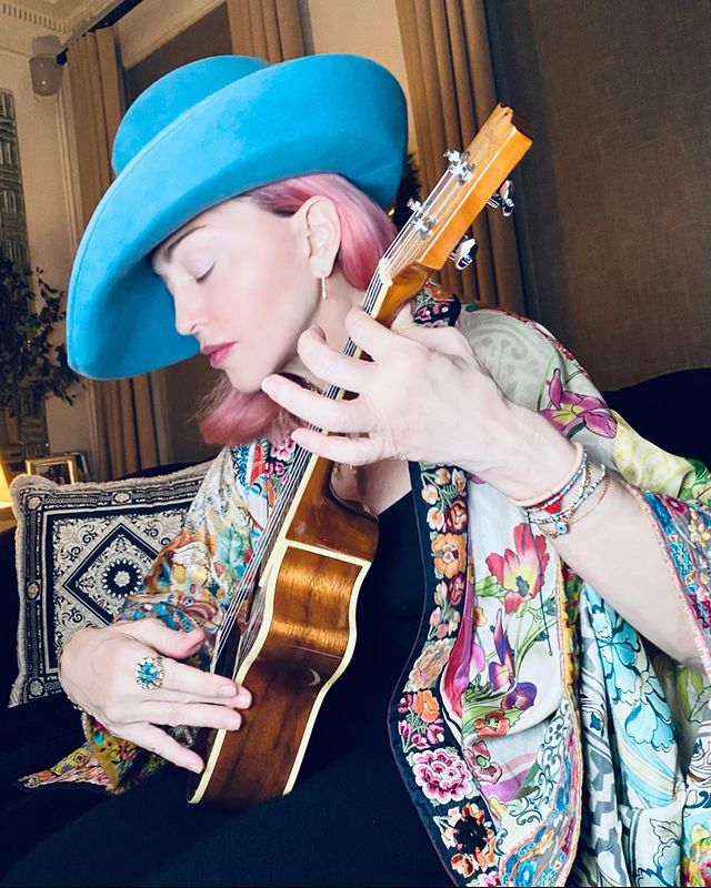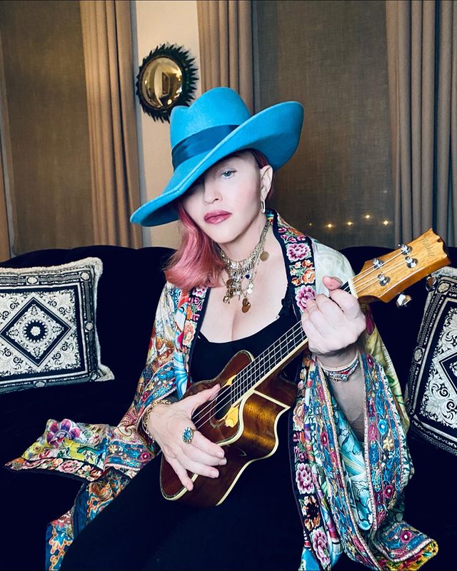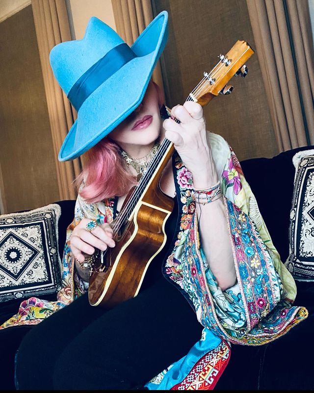 Madonna volvió a sorprendernos, aunque no sabemos mucho en qué proyectos se encuentra, su Instagram nos va dejando pistas de sus actividades cotidianas. Por lo menos, creemos que el guión de su biopic, está terminado (al menos el primer borrador) ya que hace bastante tiempo que no la cantante no volvió a subir fotos ni videos con Diablo Cody ni volvió a mencionar el tema. Por lo pronto, sabemos, que luego de aquel ritual esóterico de hace una semana atrás, la diva se encuentra ahora en New York. El 19 de Noviembre, Madonna subió un video en donde se la ve probándose una grilla para los dientes obra de Gabby Elan para Gabby Elan Jewerly, Madonna escribió acompañando la foto: «he robado una joyería». Luego, al día siguiente, nos regaló un breve video con un acto de improvisación de canto y guitarra, dijo: «espero puedan perdonarme, debo cortarme las uñas» haciendo alusión a algunos errores durante su interpretación. Madonna subió algunas fotos de esta sesión que tituló: «sombrero azul y ukulele» en donde la vemos en su sala de su mansión de New York con un ukelele y un impactante sombrero azul eléctrico.