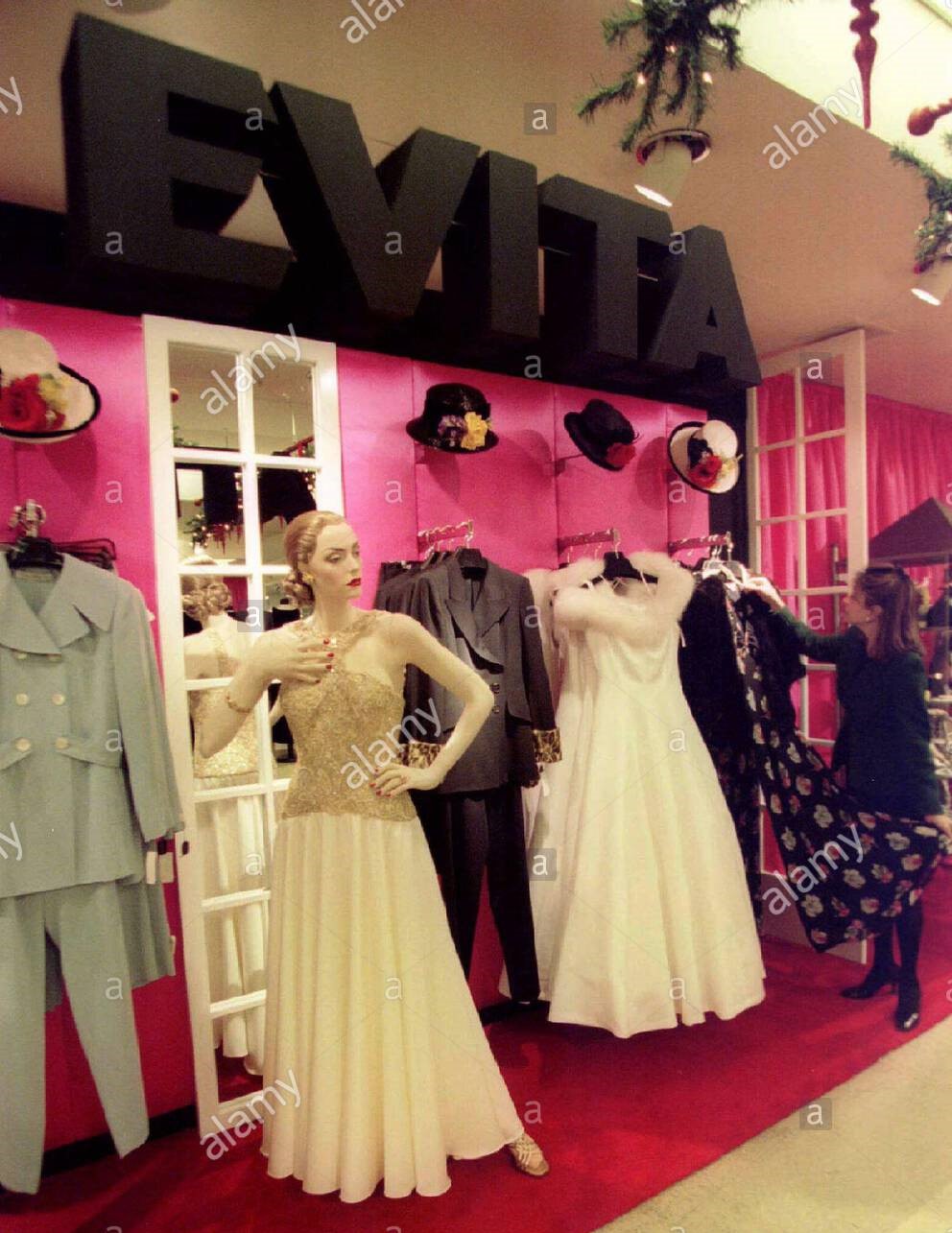 En cuanto a producción de vestuario, «Evita» fue una de las películas más impactantes y con mayor cantidad de vestuario desde el film «Cleopatra» (1963) protagonizado por Elizabeth Taylor. El departamento de vestuario, a cargo de Penny Rose, con un equipo de 72 personas en tres países diferentes diseñó, creó y confeccionó más de 40 mil prendas para todo el film. Además más de 5500 prendas se usaron de 20 casas de moda diferentes en Londres, Roma, París, New York, Los Angeles, San Francisco, Buenos Aires y Budapest, incluyendo 1000 uniformes militares. El vestuario de Madonna se componía de 85 trajes (sólo los usados en el film), 39 sombreros confeccionados a medida, 45 pares de zapatos y 56 pares de aretes, además de pulseras, brazaletes, collares, broches, etc.; la mayoría de ellos realizados en Londres. En la actualidad, la gran cantidad de estos trajes y vestidos se encuentran diseminados por el mundo en diferentes casas de subastas (el mayor lote lo tiene Julien’s) en donde podemos ver que están a la venta desde los vestidos más refinados y complejos, hasta aretes, guantes y sombreros.
