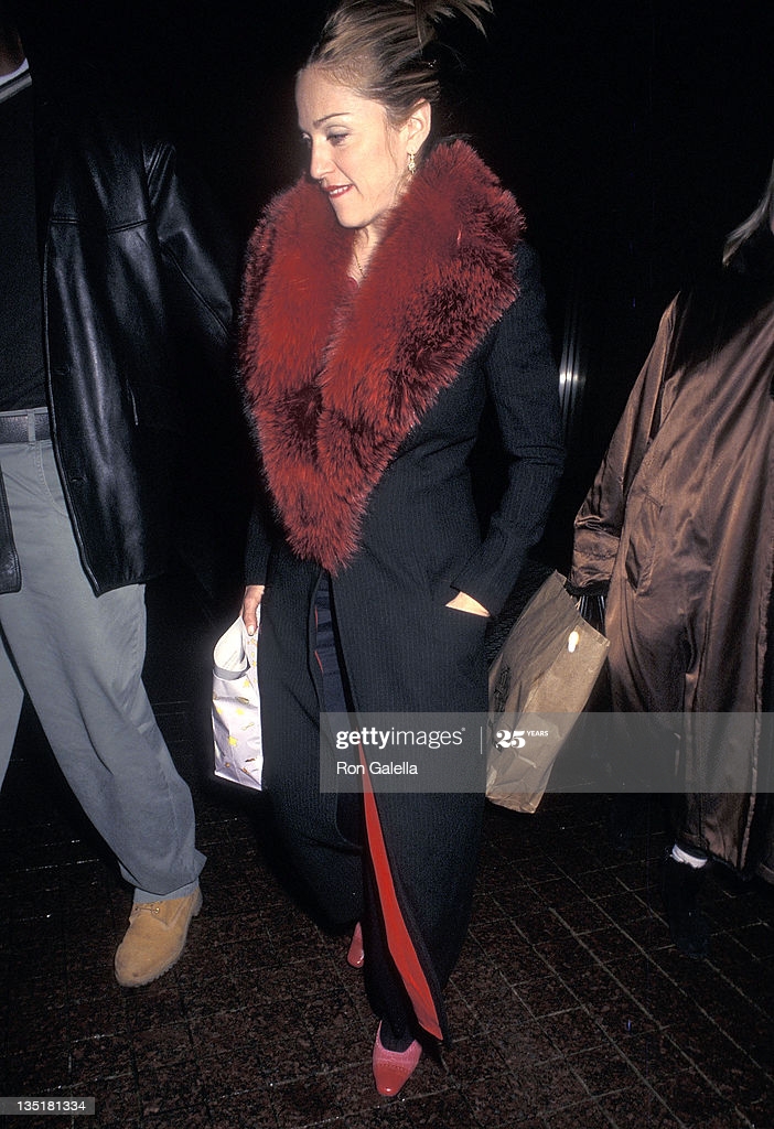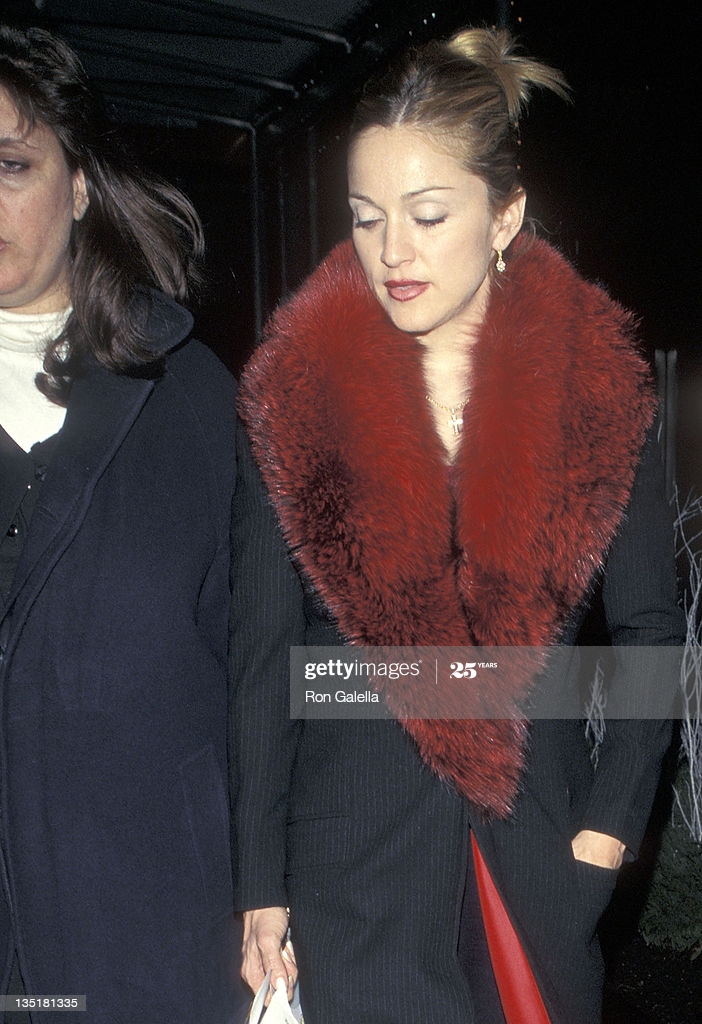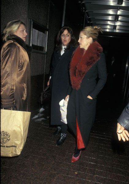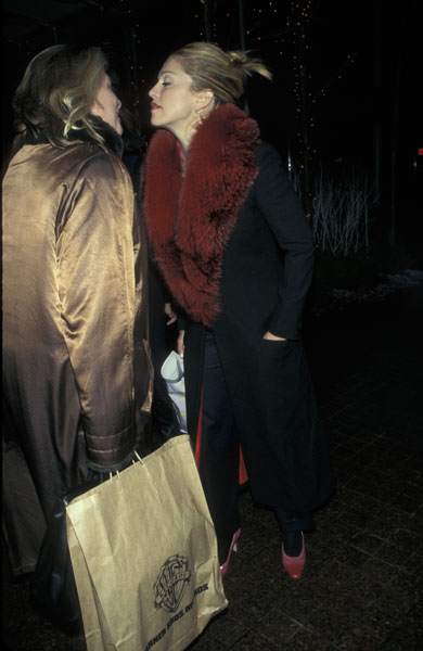Madonna fue vista saliendo a cenar al restorán «Vong» de New York, acompañada de su publicista Liz Rosemberg. Para pasar un poco el crudo invierno neoyorquino, la diva escogió un impactante tapado largo con cuello de piel en color rosa. (Foto por Ron Galella).