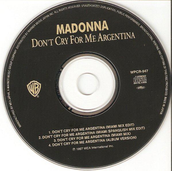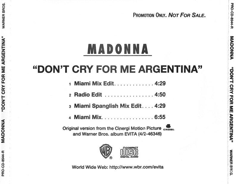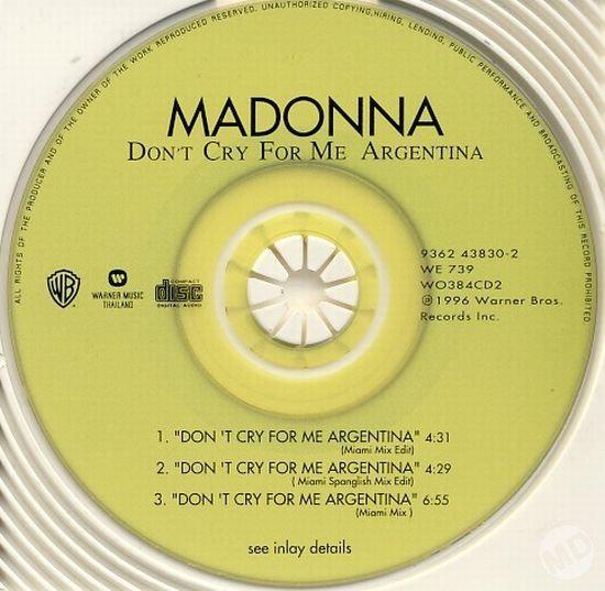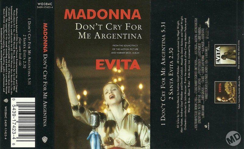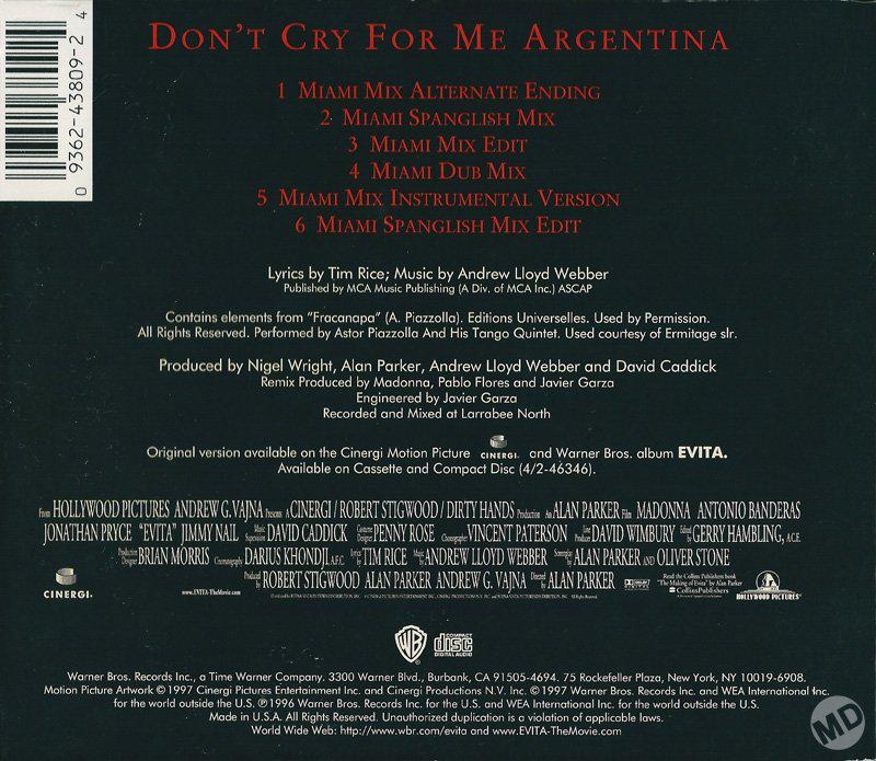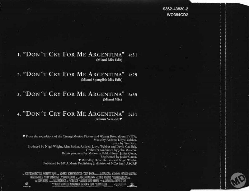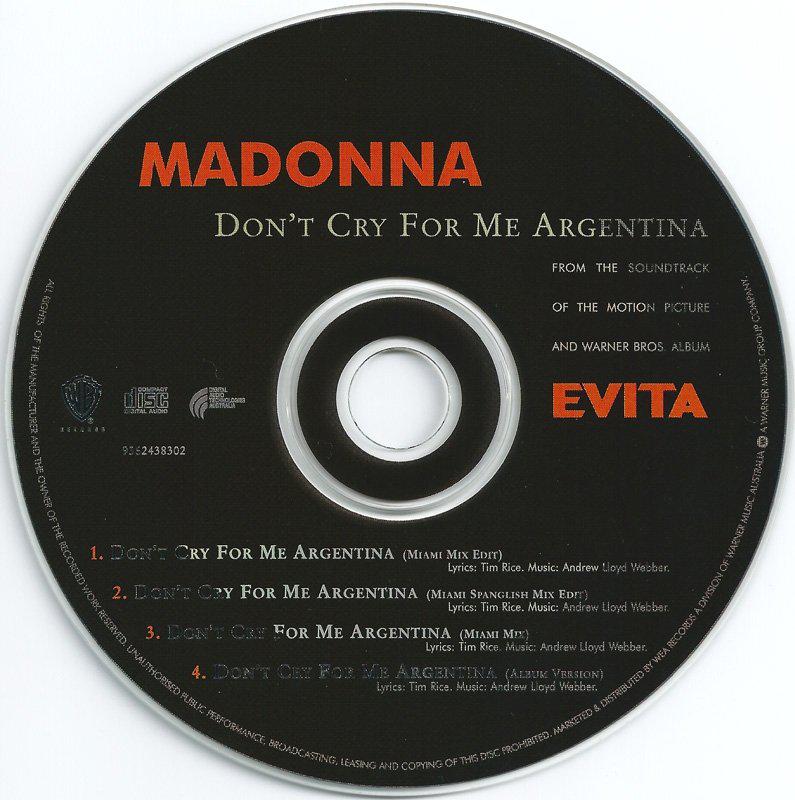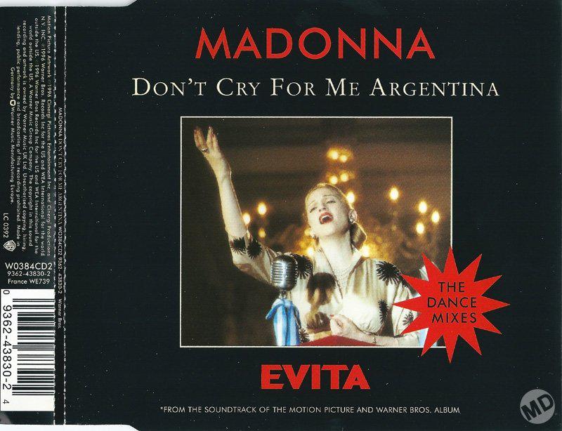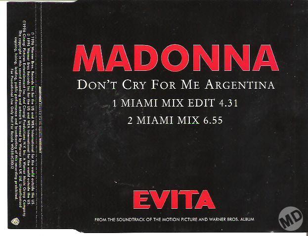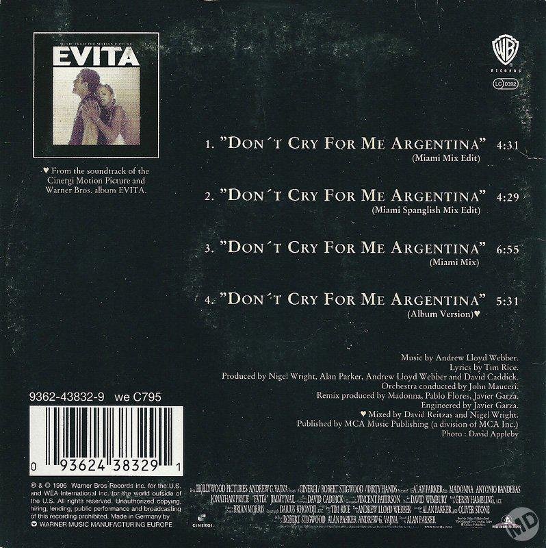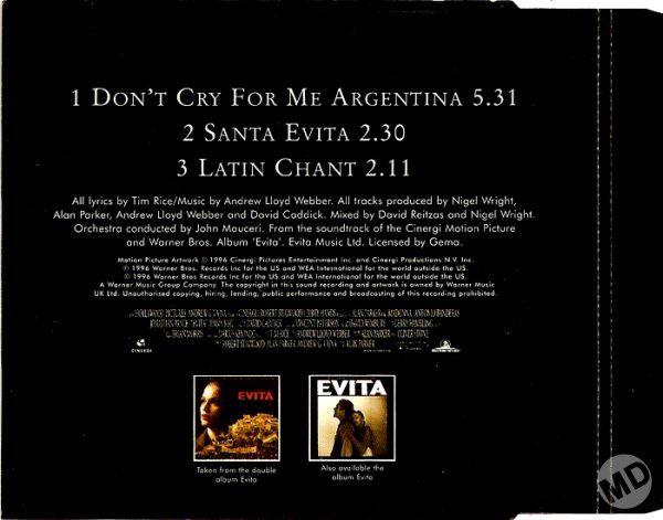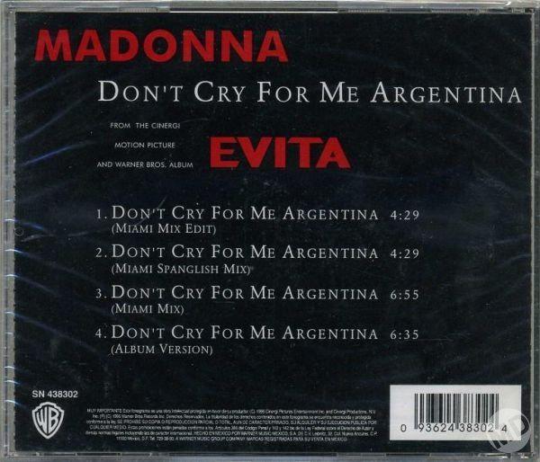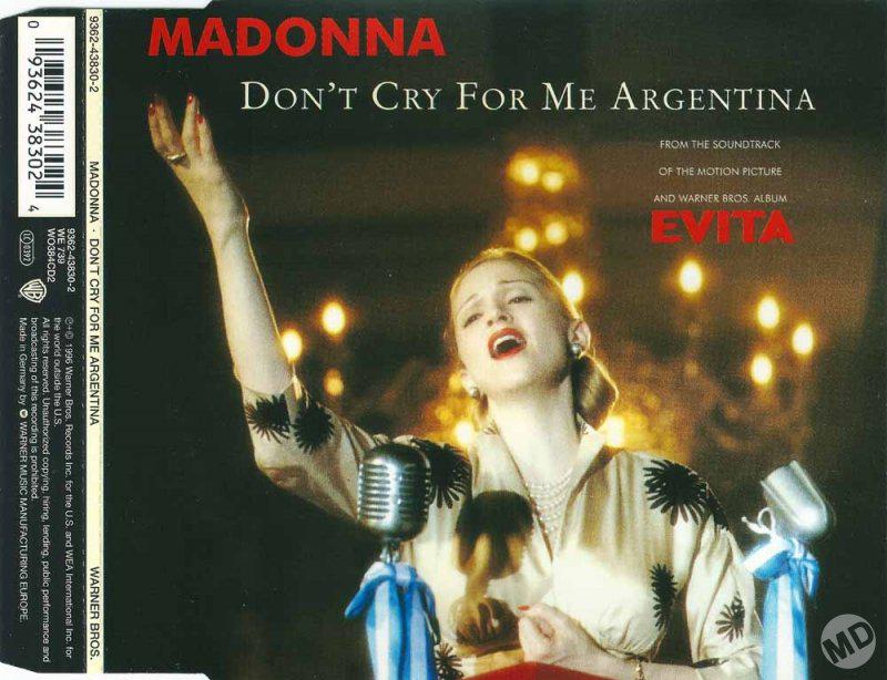 - «Don’t Cry for Me Argentina» es el segundo single extraído del soundtrack del film «Evita» lanzado el 04 de Febrero de 1997.