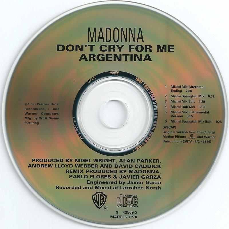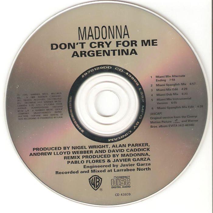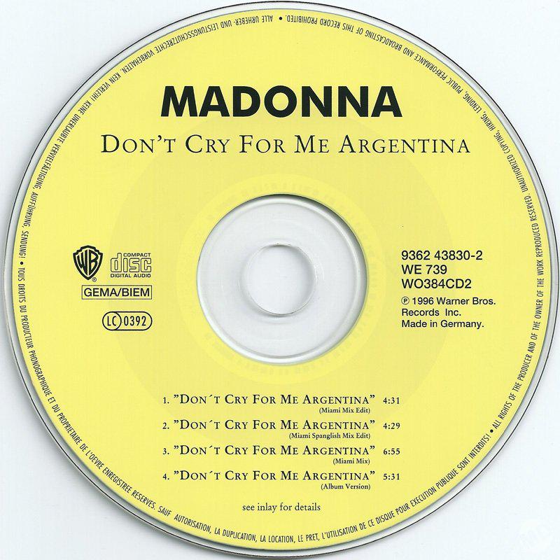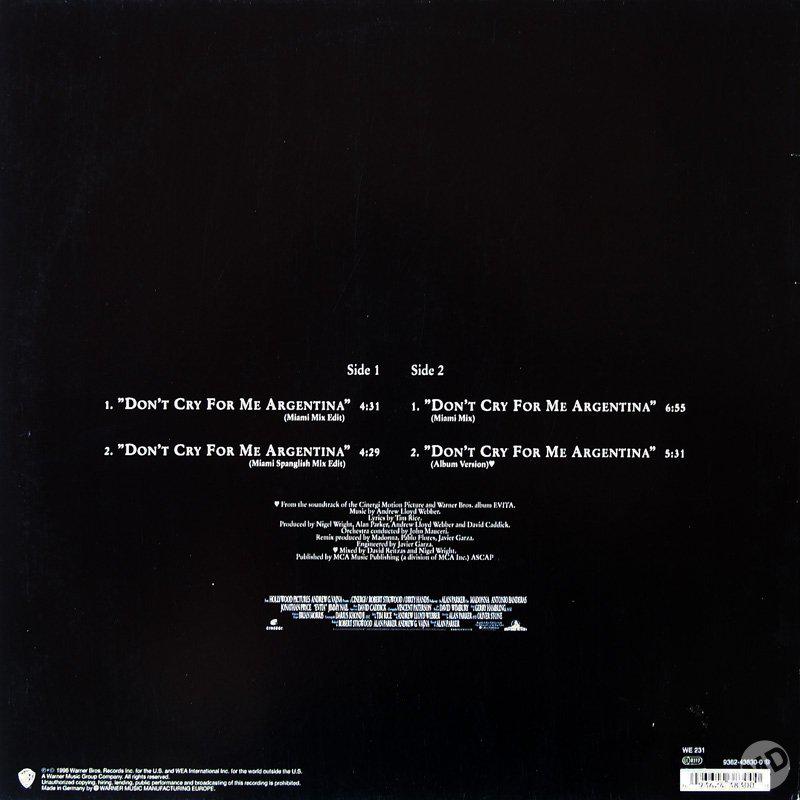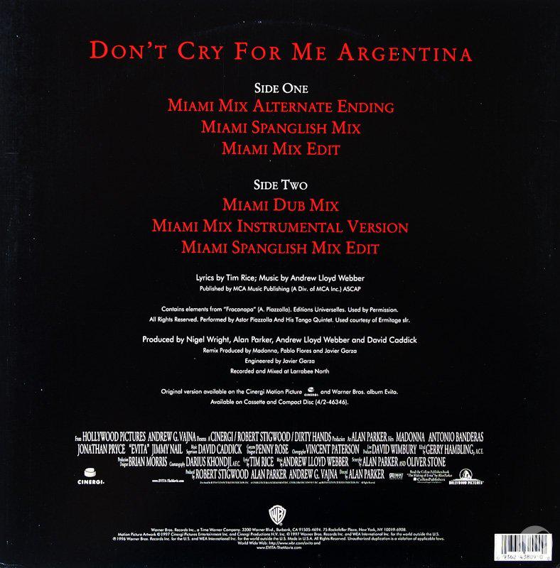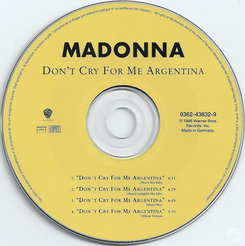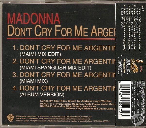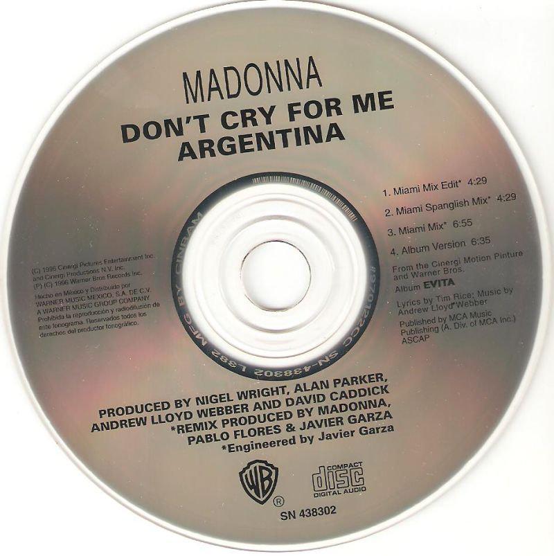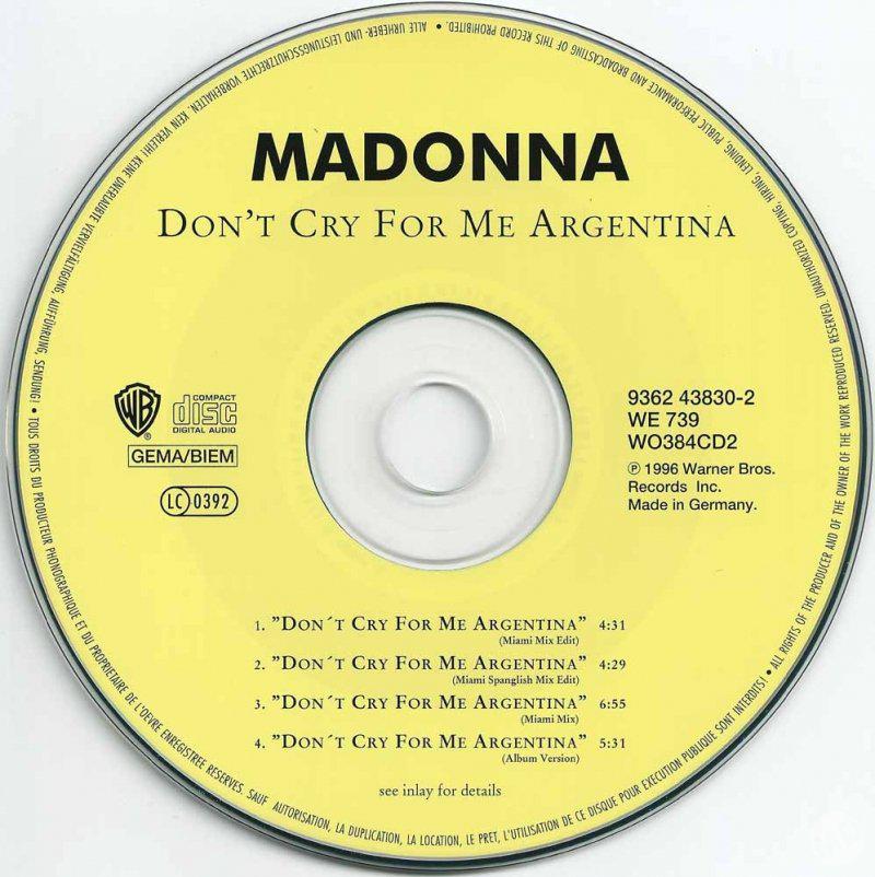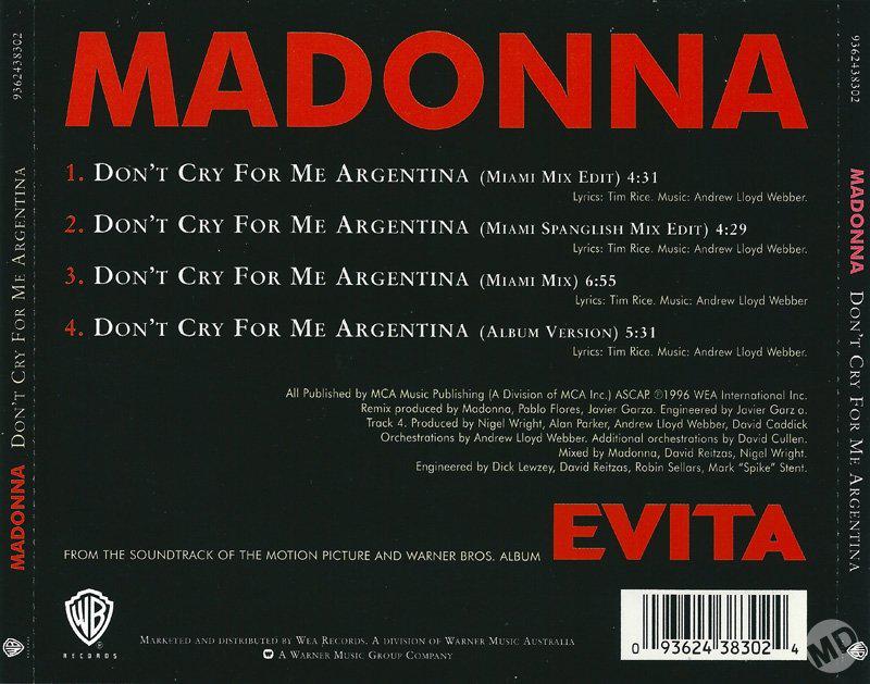 - «Don’t Cry for Me Argentina» es el segundo single extraído del soundtrack del film «Evita» lanzado el 04 de Febrero de 1997.