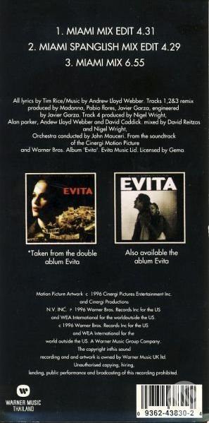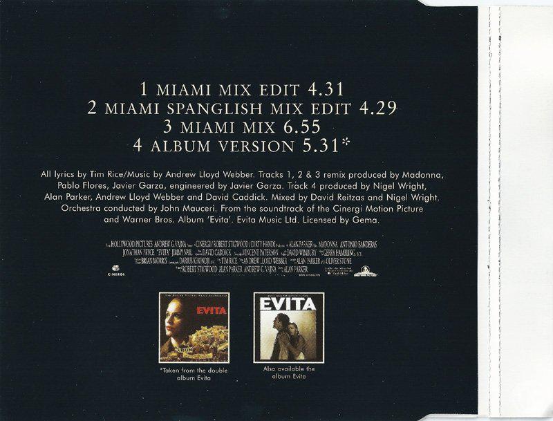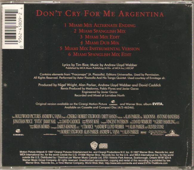 - Los remixes de «Don’t Cry for Me Argentina», titulados «Miami Mixes», estuvieron listos en dos semanas en agosto de 1996, en diciembre se distribuyeron en los clubes y radios con un amplio recibimiento por parte del público joven; lo que le permitió ingresar a los charts mundiales.