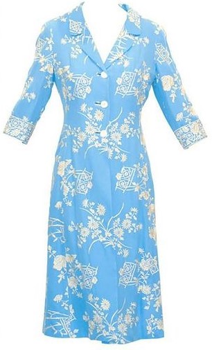 - Tapado en color celeste claro con estampado de flores en color blanco, cuello con solapa ancha y mangas 3/4 de la colección primavera-verano 1997 de la firma «Dolce & Gabbana».