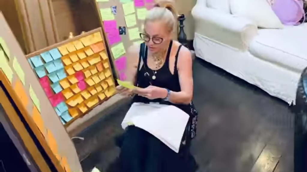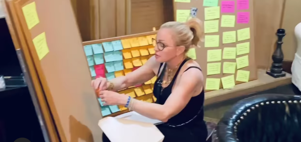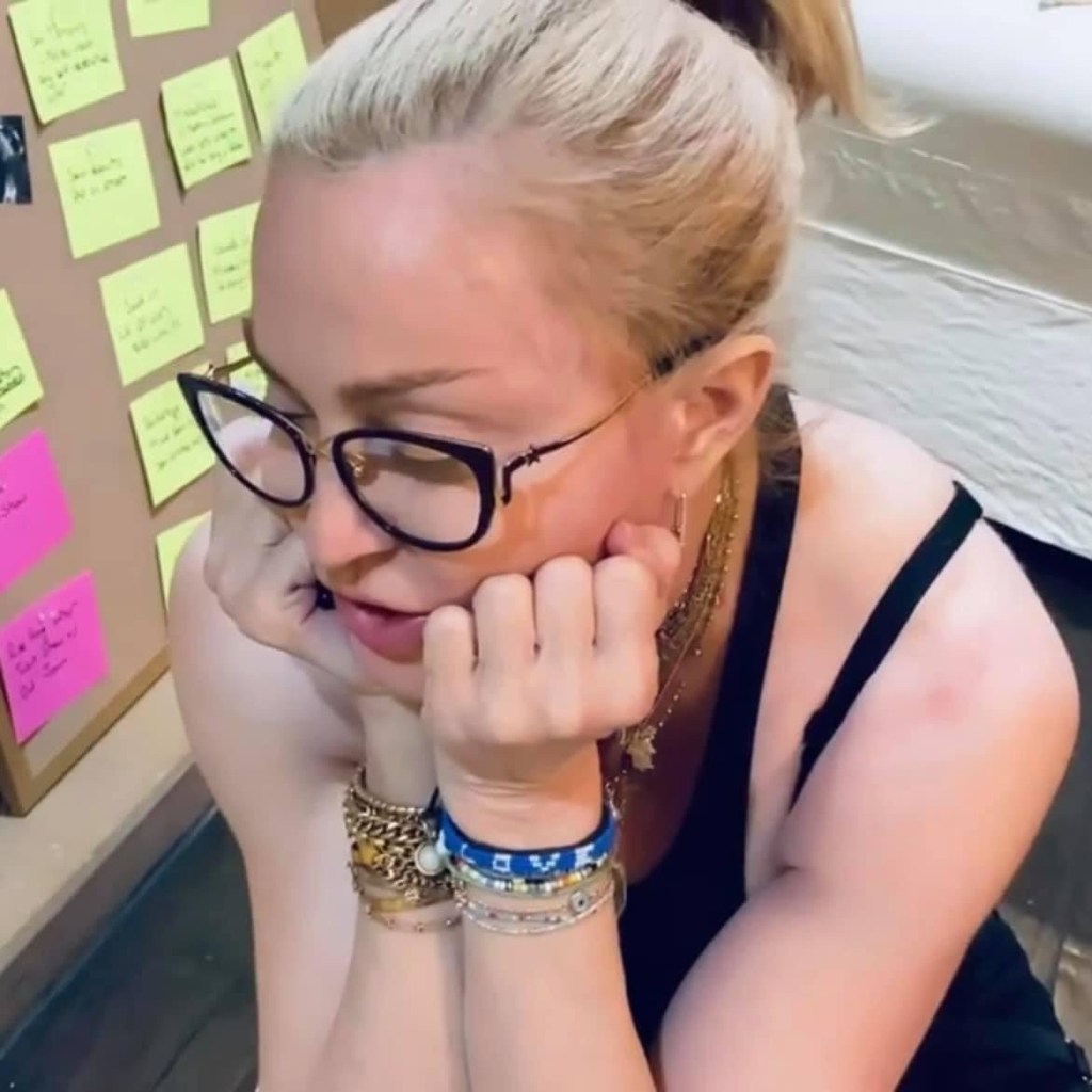 Luego de su llegada a los Estados Unidos, Madonna volvió a sorprendernos con otro cambio de look: al parecer el rosa ha quedado atrás nuevamente y la «ambición rubia» está de regreso. La cantante se mostró con el cabello un poco más corto y con el rubio platinado que la caracteriza. Pero no sólo se destacó por su cambio de color en el cabello, sino que además se puso de lleno en el guión y de su biopic con cientos de sticky notes por todas partes con fragmentos de su vida: «momento de guión. Haciendo un mapa de mi vida la que fue glamorosa y divertida y loca pero irónicamente esta parte no lo es!».