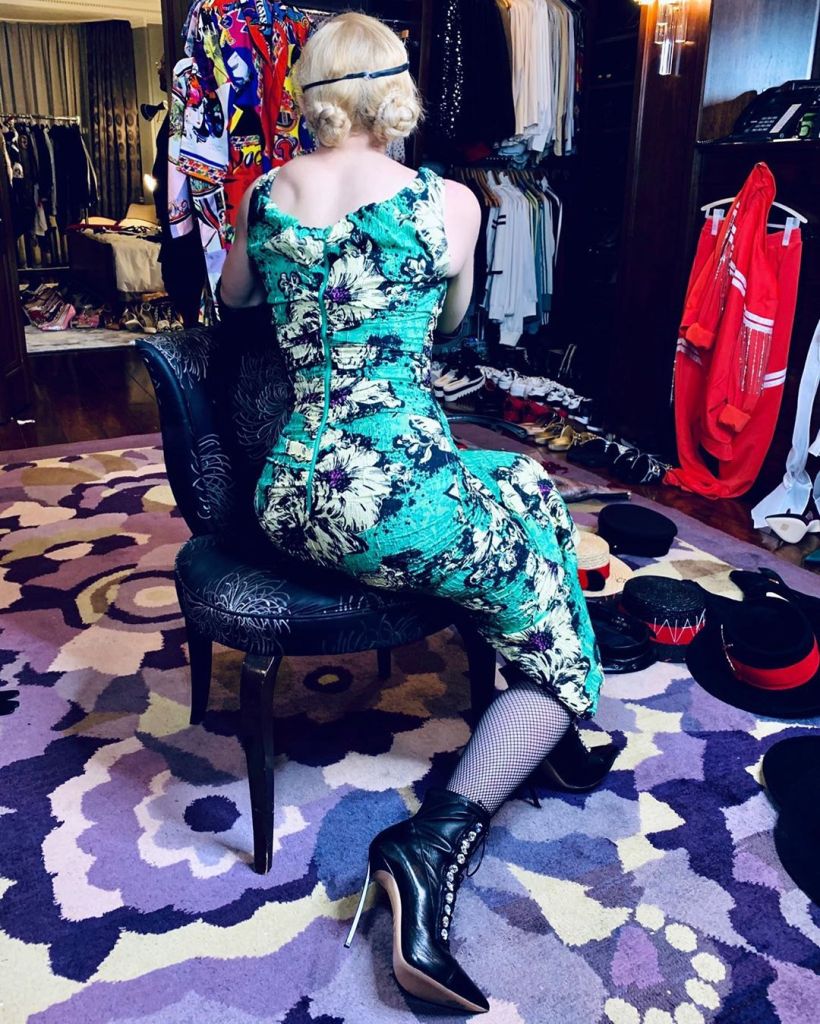 Este es un vestido de corte clásico, falda larga, ajustado al cuerpo sin mangas, color verde con estampado de grandes flores en blanco y negro. Pertenece a la colección otoño-invierno 2018 de la firma Miu Miu. Madonna usó por primera vez este vestido para la producción de fotos a cargo de Mert & Marcus para revista «Vogue» Italia (edición agosto 2018) en Lisboa. Al parecer a Madonna le ha gustado tanto la prenda que decidió quedársela para volver a lucirla en otra oportunidad. Primero la lució para una sesión de fotos en su mansión de Manhattan a cargo de Ricardo Gomes y luego la usaría ni más ni menos que para la rueda de prensa del álbum «Madame X» realizada en el London House, Londres en junio de 2019. Pero no queda aquí, ya que el vestido tuvo otra revancha para lucirse y fue justamente dos años después de que sea usado por primera vez, en esta ocasión, Madonna lo vistió para festejar su cumpleaños en Jamaica en agosto de 2020. Definitivamente, este fue uno de los vestidos más adorados por nuestra diva durante estos últimos años ¿tendremos posibilidad de verlo nuevamente?