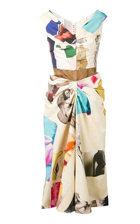 Vestido de seda corto, con escote, sin mangas color beige claro con estampado de figuras multicolor, perteneciente a la colección primavera-verano 2019 de la firma Marni. Madonna usó este vestido por primera vez durante la rueda de prensa del álbum «Madame X» realizada en Londres en junio de 2019 y luego volvería a repetirlo durante su celebración del año nuevo 2020 mientras vacacionaba con su familia en Maldivas.