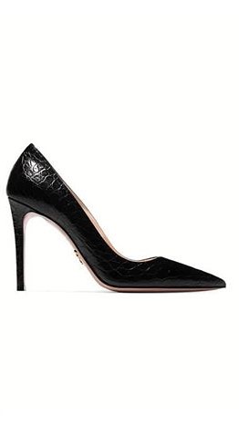 Zapatos de cuero negro símil cocodrilo taco «stilleto» de la colección otoño-invierno 2019 de la firma Prada usados para el portfolio del disco «Madame X» tomado por Steven Klein y luego durante el video «God Control».