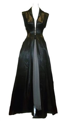 - Vestido por capas en sega, taffeta y tul con apertura en frente, sin mangas en diferentes gama de grises de la colección otoño-invierno 1998 de Olivier Theyskens.