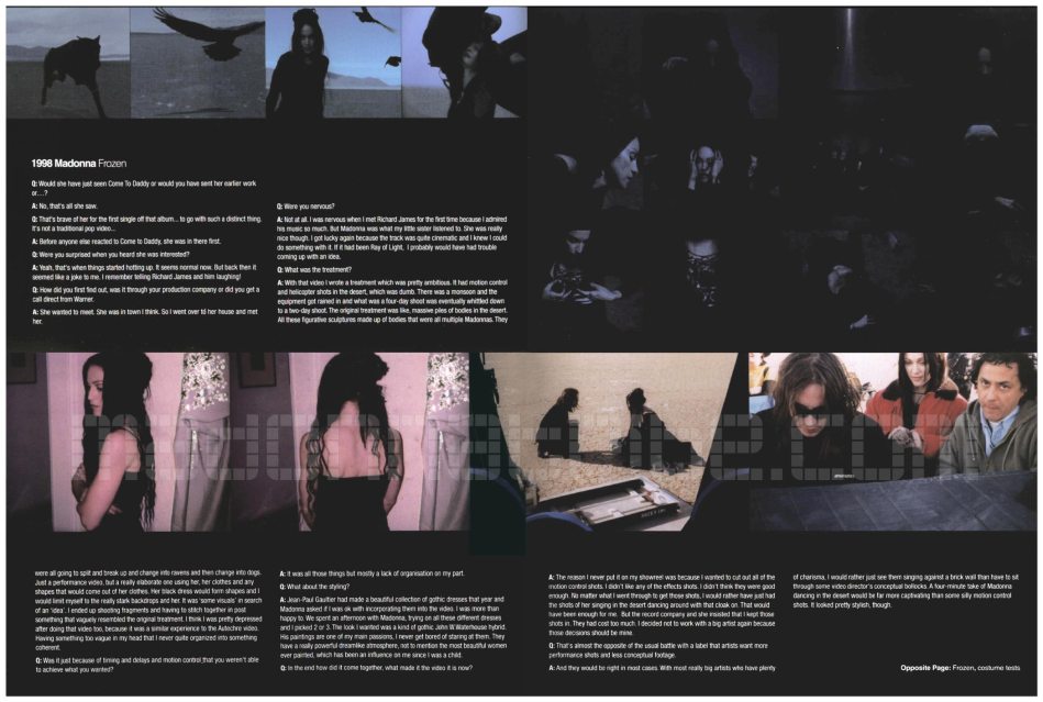 - Con ese video escribí un tratamiento que fue bastante ambicioso. Tenía control de movimiento y disparos de helicópteros en el desierto, lo cual era tonto. Hubo un monzón y el equipo y la lluvia en lo que fue un rodaje de cuatro días finalmente se redujo a un rodaje de dos días. El tratamiento original era como montones masivos de cuerpos en el desierto. Todas estas esculturas figurativas formadas por cuerpos que eran múltiples Madonnas, todos se iban a dividir y romper y cambiar en cuervos y luego cambiar en perros. Solo un video de actuación, pero uno realmente elaborado usándola a ella, su ropa y cualquier forma que pudiera salir de su ropa. Su vestido negro tomaría formas y yo me limitaría a fondos realmente crudos y a ella. Fue algo visual en busca de una idea. Terminé disparando fragmentos y teniendo que unirlos en algo que se parecía vagamente al original después del tratamiento. Creo que yo también estaba bastante deprimido después de hacer ese video, porque era similar a la experiencia del video de Autechre. Tener algo demasiado vago en la cabeza que nunca he organizado en algo coherente.