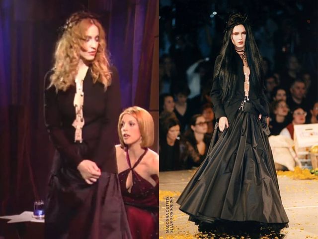 - Falda y blusa de seda en color negro sostenida por broches en el frente y corona de espinas todo obra del diseñador Jean-Paul Gaultier para su colección otoño-invierno 1998. Madonna usó el mismo atuendo para otras presentaciones en Europa.