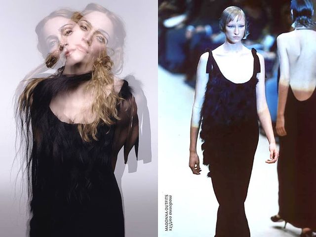 - Vestido de seda negro con escote cuadrado y mangas largas perteneciente a la colección otoño-invierno 1998 de la firma Balenciaga (el mismo vestido ya había sido usado por Madonna para su aparición en la entrega de los Golden Globes en enero de 1998).
