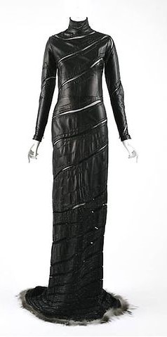 - Vestido de cuero negro, mangas largas y espalda abierta, con aplicaciones de tul, tranparencias, lentejuelas y plumas de la colección otoño-invierno 1999 de Versace.