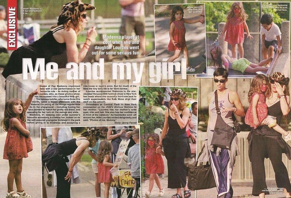 Madonna decidió disfrutar de los últimos calores de la primavera neoyorquina dandole un gusto a su pequeña hija Lourdes. Así, junto a la in-se-pa-ra-ble Ingrid Casares, la Reina del Pop decidió pasar parte de la tarde en el Central Park. Lourdes disfrutó de un momento de juegos con otros niños, su madre la ayudó con los columpios, tuvo una sesión de pintura de rostro, carreras y juegos. Madonna e Ingrid, la controlaban y cuidaban de cerca. Madonna, ya había comenzado a mostrar un poco el estilo de su nuevo alter ego que aparecería en su disco «Music», luciendo un sombrero de cowboy animal print.