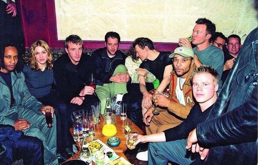 Arriba, en noviembre de 1999 en Chinawhite, West London, durante la primera salida en grupo. Madonna y Ritchie compartieron mesa con David Collins, Maxim Reality (Prodigy), Matthew Vaughn, William Orbit, Goldie, Pete Tong y Ferry Corsten. Abajo: con Ritchie saliendo de ICA «Institute of Contemporary Arts» en Saint James, Londres.