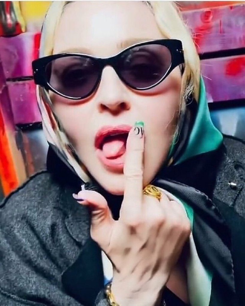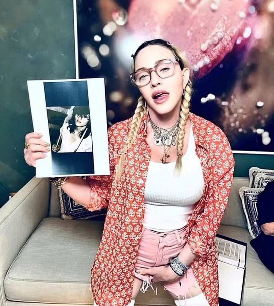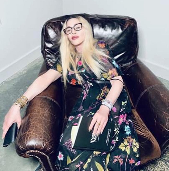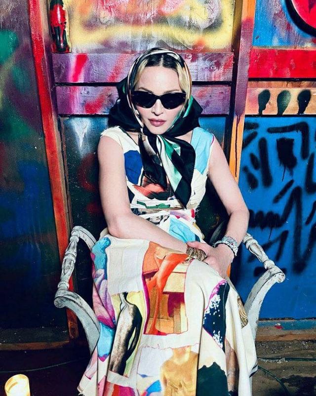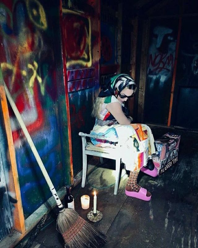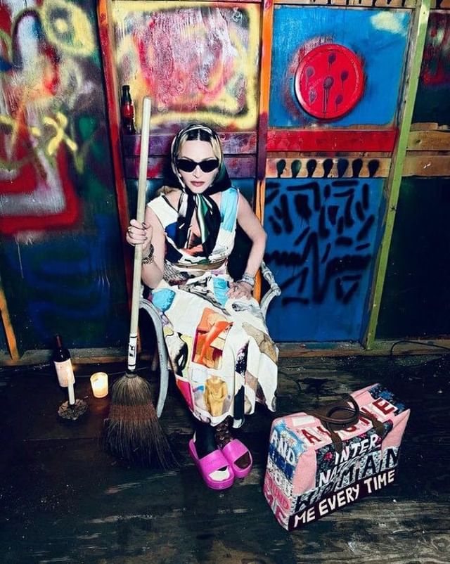 «El pasado no se ha ido… El pasado ni siquiera es el pasado», esto escribía Madonna en un posteo de instagram bastante curioso. La vemos en una especie de cabaña de madera pintada de varios colores y repleta de graffitis. Ella se mantenía sentada en un sillón con gafas negras, pañuelo en la cabeza, el vestido multicolor de Marni, una pantuflas de goma en color rosa y medias diferentes en ambos pies. Un estilo demasiado particular. La acompañaban algunos objetos como una botella de vino, unas velas, una maleta vieja (intervenida artísticamente) y una escoba. La diva subió un video en donde la vemos bailar y contonearse con la música de su canción «Erotica» (1992).