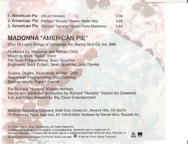 - Los remixes de «American Pie» estuvieron a cargo de Victor Calderone y Richard «Humpty» Vission.