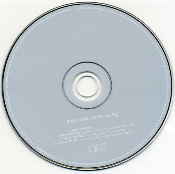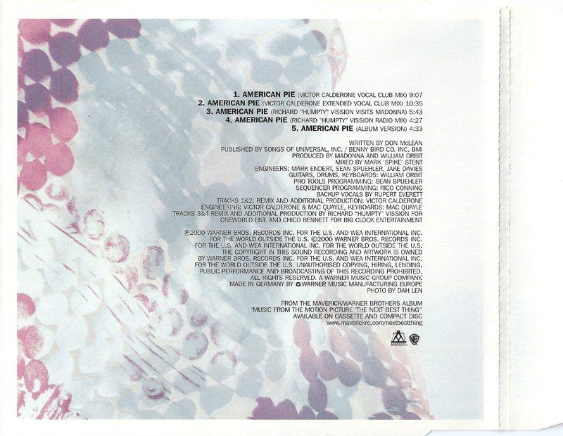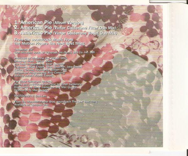 - La canción fue incluida en el soundtrack del film «The Next Best Thing», editado por Maverick, en Marzo de 2000, pero además se incluyó a último momento en el disco «Music», lanzado más tarde ese mismo año. Madonna no quería que «American Pie» forme parte de su nuevo LP ya que consideraba que no se vinculaba artísticamente; sin embargo tuvo que ceder ante las presiones de la Warner, quienes querían que la canción estuviera disponible en USA ya que no había sido lanzada como single en dicho país. Debido a esto, cuando se decidió lanzar el recopilatorio «GHV2» en 2001, Madonna se negó rotundamente a que «American Pie» forme parte de este disco.