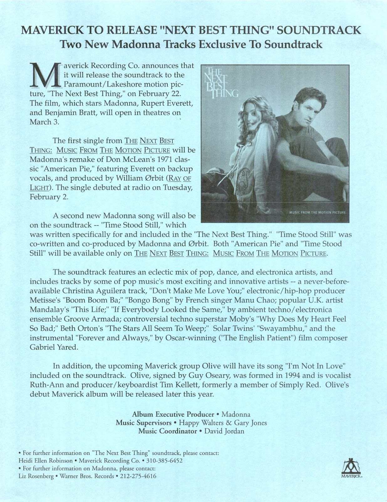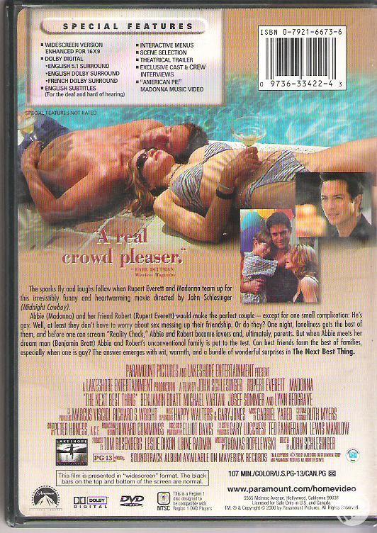 - «The Next Best Thing» es una comedia dramática protagonizada por Madonna, Rupert Everett y Benjamin Bratt; dirigida por John Schlesinger.