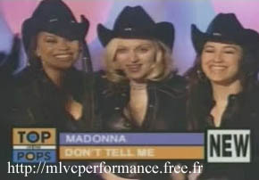 Luego del estreno del video «Don’t Tell Me» en el programa «Top of the Pops» de la BBC de Londres, el 17 de Noviembre, Madonna realizó una interpretación en playback junto a toda su banda de la canción. El programa se transmitió el 24 de Noviembre. Durante este mismo programa, se realizó la grabación de «Music» que se transmitió como programa especial el 25 de Diciembre.
