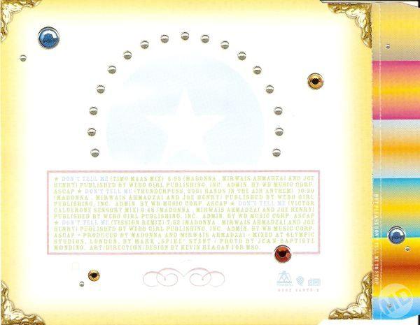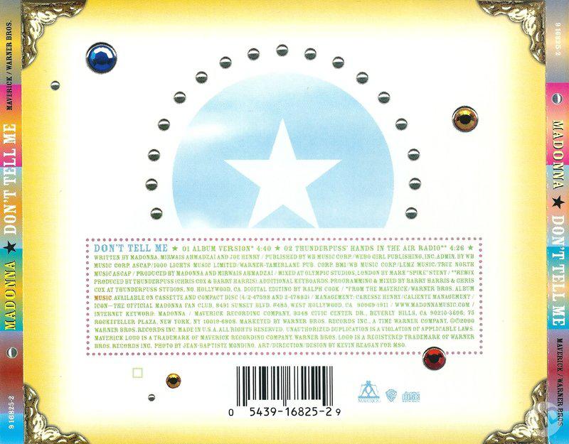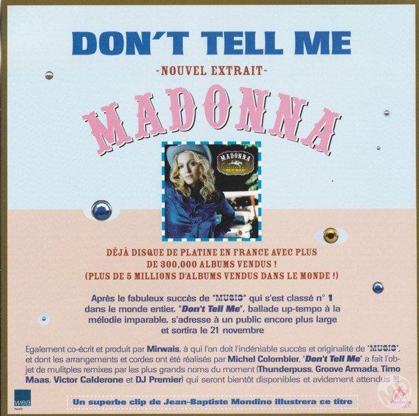 - «Don’t Tell Me» es el segundo single lanzado del disco «Music» el 21 de Noviembre de 2000.