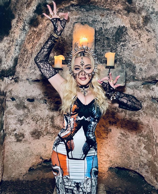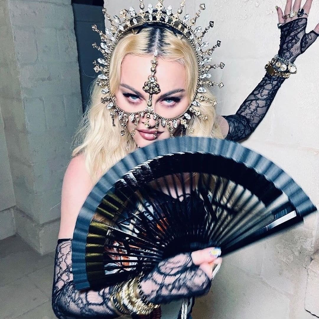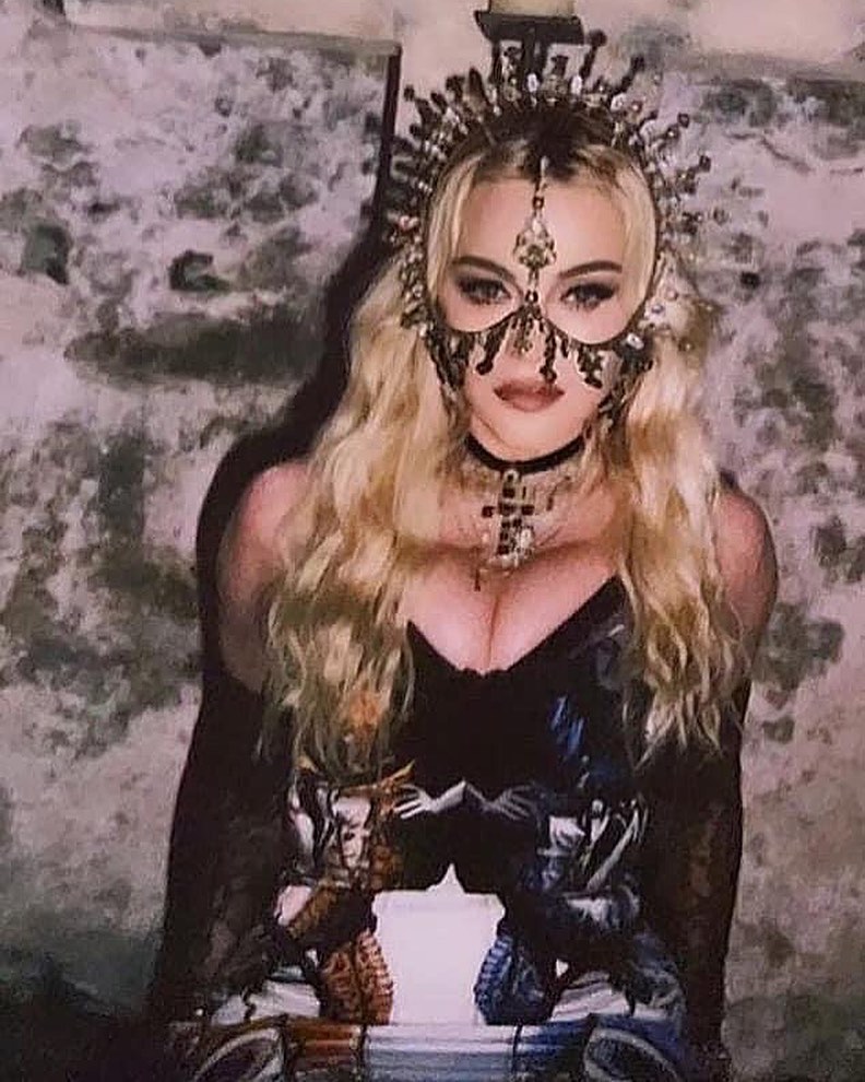 Para lucir según las celebraciones, Madonna usó un ajustadísimo vestido de algodón elastizado, realizado especialmente por el diseñador Ricardo Tisci para la firma «Burerry» en base a un estampado a mano, diseño titulado «Mermaid». Los zapatos de tacón fueron realizados a medida por «Miu Miu» y son los zapatos que Madonna usa habitualmente para cada ocasión e incluso durante sus últimas giras, «The Rebel Heart Tour» y «The Madame X Tour». y una impactante corona de piedras y cristales. Madonna completó el estilo con un par de guantes largos sin dedos en encaje negro vintage de la colección otoño-invierno 2011 de «Chanel». Con respecto a las joyas, la diva lució un colgante choker negro con una cruz en oro amarillo, blanco y zafiros engarzados de la firma «Dolce & Gabbana» y una impresionante pieza de oro con diamantes tipo corona y que cubría parte de su rostro del diseñador indonesio Rinaldi Yunardi. El estilismo estuvo a cargo de Saint Rita, el peinado por Andy LeCompte y el maquillaje por Aaron Henrikson.