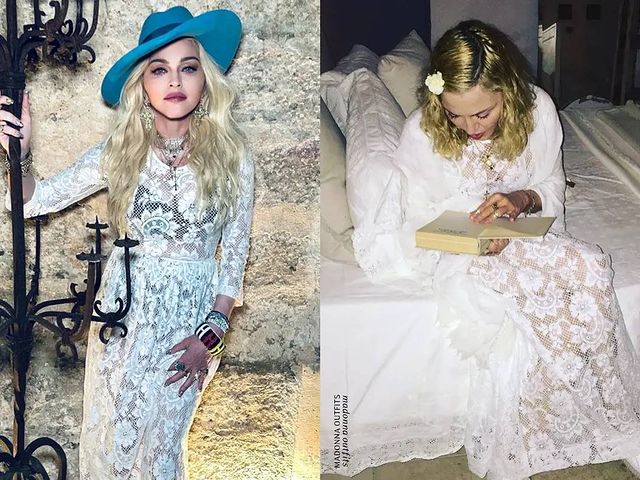 - Vestido de encaje blanco vintage sin marca, comprado y usado, por Madonna durante las celebraciones de su cumpleaños en 2017 también en la región de Puglia.