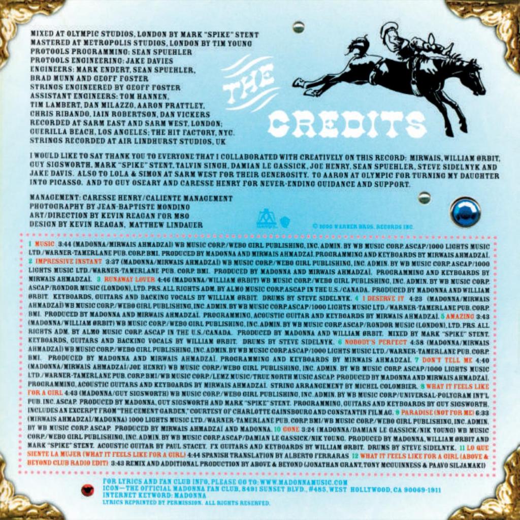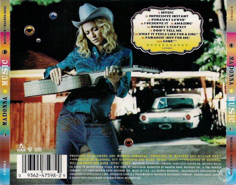 Para el CD se incluyó un booklet como ya era costumbre, sin embargo con «Music» fue la primera vez que no se incluyeron las letras de las canciones. Esta costumbre se mantendría con el resto de los lanzamientos de Madonna. El booklet de «Music» incluía más fotografías, incluso con cambio de vestuario en donde vemos a Madonna con una camisa amarilla, jeans y sombrero de cowboy rosa con una tiara de brillantes. El librillo mostraba además fotos de una guitarra sobre fondo de paja, sombrero y parte de la letra de la canción «Music» distribuida en varias de sus hojas. Tiene una hoja final con los créditos.