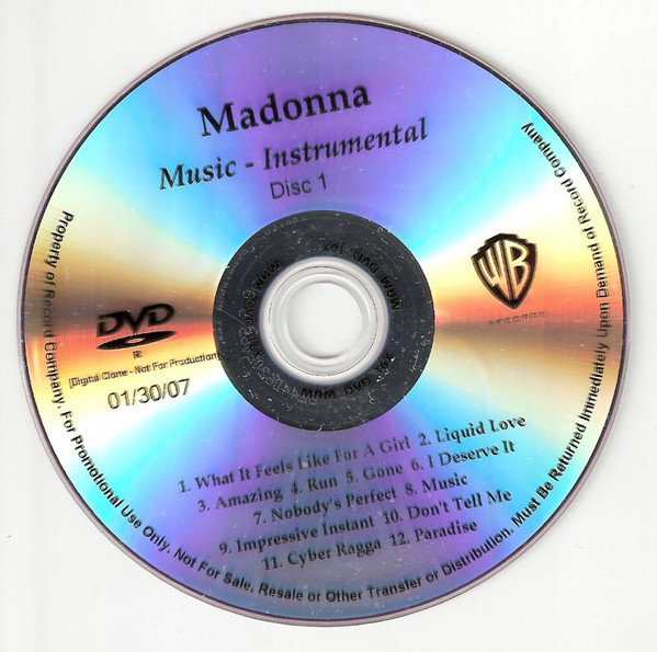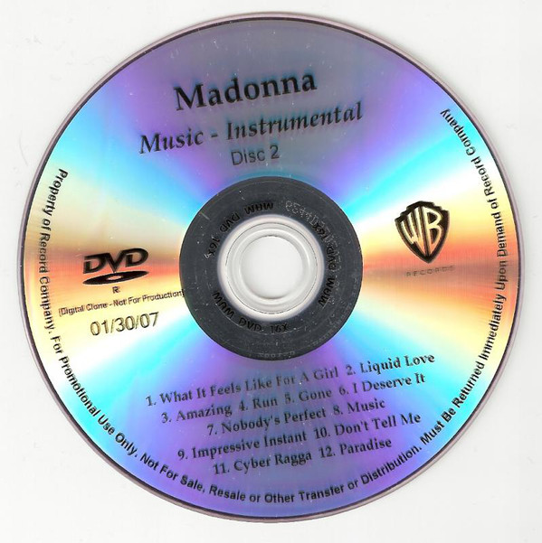 «Music» (03:31): el demo final se filtró en Internet el 27 de mayo de 2000. La única diferencia entre esta versión y la versión del álbum es la duración; el coro se repite dos veces al final de la canción, en lugar de que solo se escuche una vez como en el álbum. El instrumental que se ha filtrado a lo largo de los años es en realidad esta versión. Se han filtrado, además, otros demos a lo largo de los años, incluida una versión muy temprana que incluye letras alternativas: «¿te gusta el tango, boogie woogie?», Y presenta a Madonna hablando con Mirwais, «esta introducción es demasiado larga, es demasiado larga, sí…”. Existen 3 de estas primeras tomas de demostración denominada «Demo Take 1,2 y 3». Otra versión de «Music» que se filtrará a lo largo de los años es un demo extendido de 05:51, que tiene una apertura y un cierre más largos sin fade-out. Otra cosa interesante acerca de esta versión extendida es que la línea de apertura cantada por Madonna no está filtrada ni codificada como en el álbum.