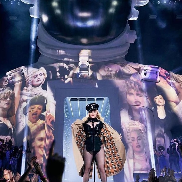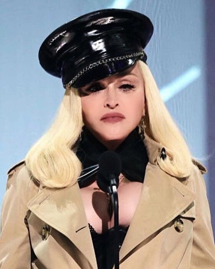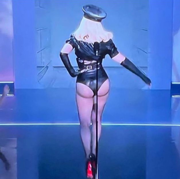 Luego del video, la cantante aparece en el escenario saliendo desde el pecho de un gigante astronauta en donde se proyectaban varias imágenes de ella en actuaciones previas en dichos premios (el astronauta hace referencia a la estatuilla que se entrega como galardón). Enfundada en un sobretodo beige de Burberry, una gorra de cuero y unos zapatos de tacón altísimos, Madonna aparece para llegar al micrófono y quitarse el sobretodo. Nos revela un look dominatrix con un ajustadísimo corset, sostén, delantal y guantes largos, todo en cuero y látex negro. «Y decían que no duraríamos… ¡pero aún estamos aquí hijos de puta! ¡Feliz cuarenta aniversario MTV! Bienvenidos a los premios MTV Video Music Awards 2021». Dicho esto, Madonna se retira del escenario para mostrar su voluminoso trasero enfundado en mini short. Con sus 63 años, la diva demostró que no tiene nada que esconder y nada que cubrir y que Madame X guarda dentro de sí un poquito de aquella querida y recordad Dita Parlo.