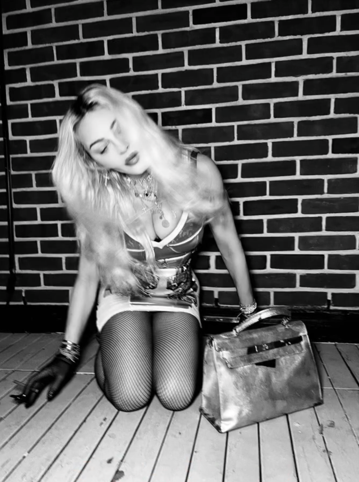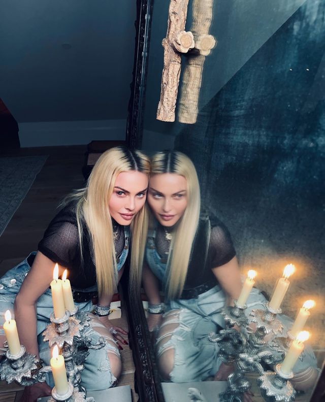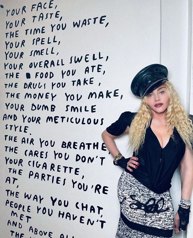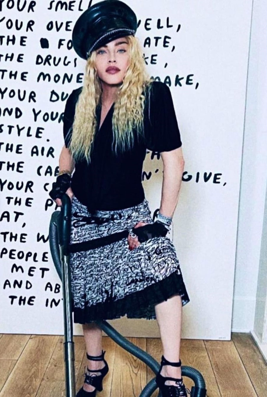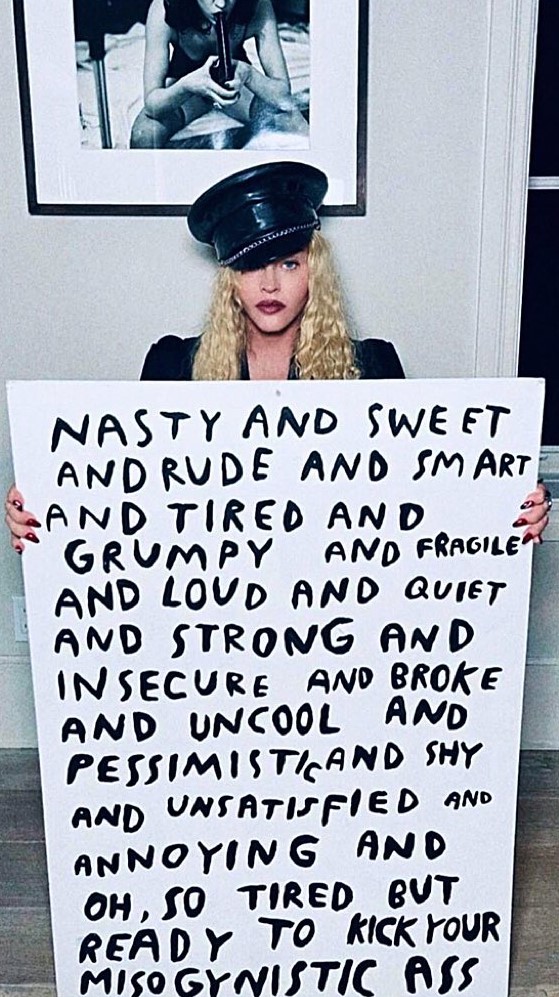 Madonna fue fotografiada por Steven Klein, luciendo una gorra de cuero, falda y sosteniendo un cartel con un mensaje sobre la misoginia. En su posteo escribió: «estado de ánimo: limpiando la casa con la ayuda de Helmut Newton».