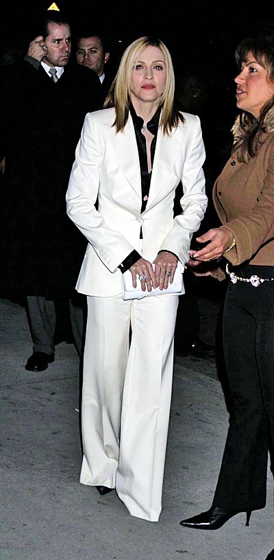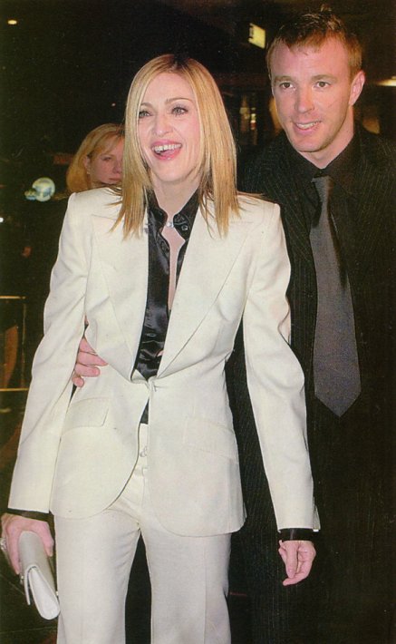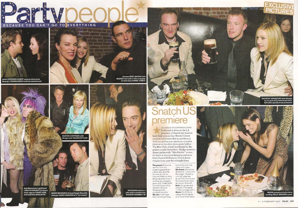 Luego de haber dirigido el film «Lock, Stock and two Smoking Barrels» en 1998, Guy Ritchie estrena una nueva película con un elenco estelar con nombres como Benicio Del Toro, Stephen Graham, Alan Ford, Brad Pitt, Dennis Farina, Rade Serbedzija, Robbie Gee, Lennie James, Vinnie Jones, Mike Reid, Jason Flemyng y Andy Beckwith entre otros. La película se tituló «Snatch» a nivel mundial y «Cerdos y Diamantes» en España y fue estrenada en Enero del 2001. El 18 de ese mes, se realiza el estreno para prensa en el «Directors Guild of America». Madonna acompañó a su marido en la alfombra roja y a pesar de que todos los flashes apuntaba a ella, la diva trató de mantenerse al margen para no opacar la noche de su flamante marido. Madonna lució una camisa de seda negra y un traje blanco entallado con un bordado de cristales en la espalda con la leyenda «Mrs. Ritchie» («Señora de Ritchie»).