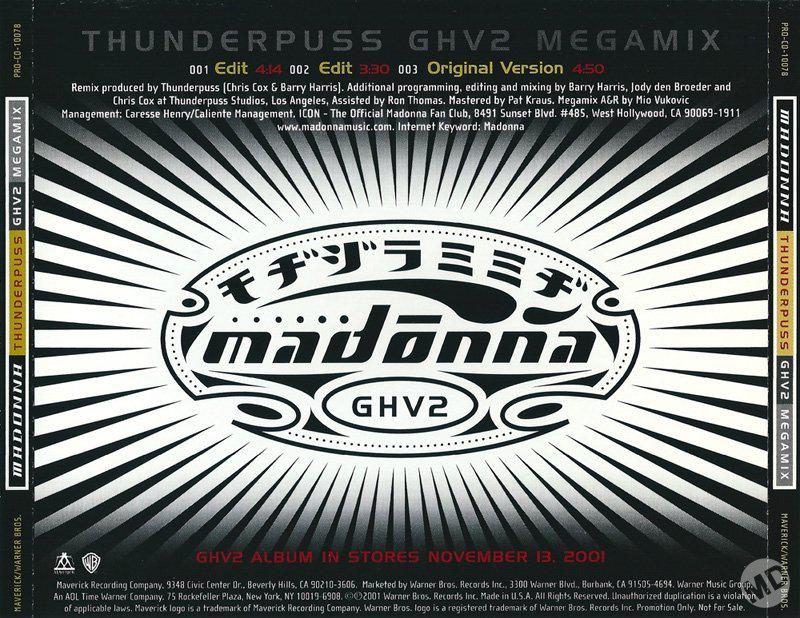 - «Thunderpuss Megamix» es un remix compilado de varias canciones de Madonna incluidas en el disco «GHV2» lanzado el 04 de noviembre de 2001 como single promocional de dicho disco.