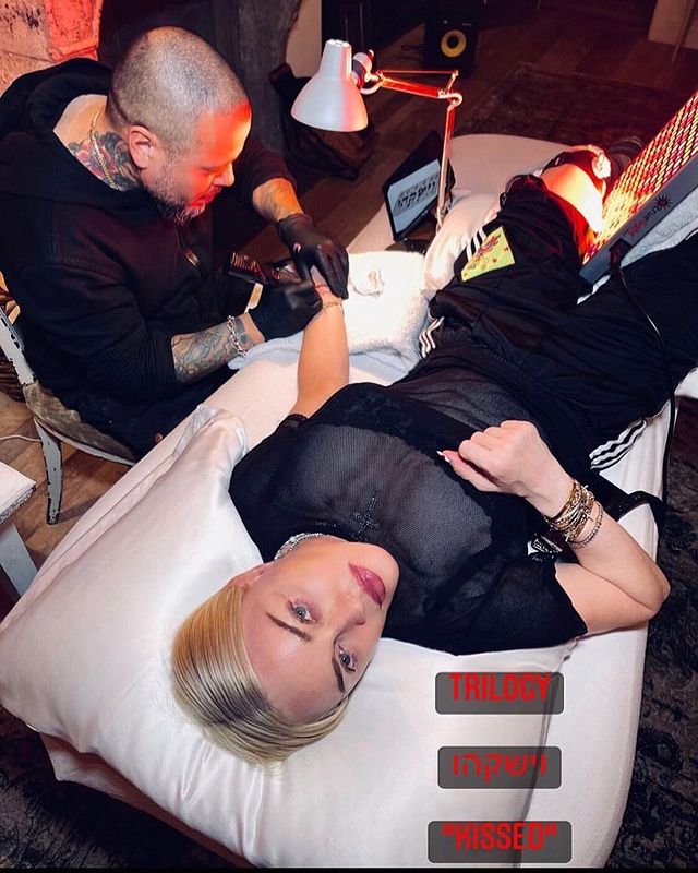 Madonna ha decidido realizarse un nuevo tatuaje; otra vez en la muñeca izquierda; debajo del que ya tenia previo con las iniciales de todos sus hijos. Esta vez fue la palabra «kissed» («besada») escrita en letras hebreas. La cantante mostró el proceso con un video en su cuenta de Instagram y escribió: «completanto la trilogía de tatuajes…este año escogí ‘kissed’. La vida es un viaje para remover el espacio entre nosotros, la humanidad y Dios. Feliz Chanukah».