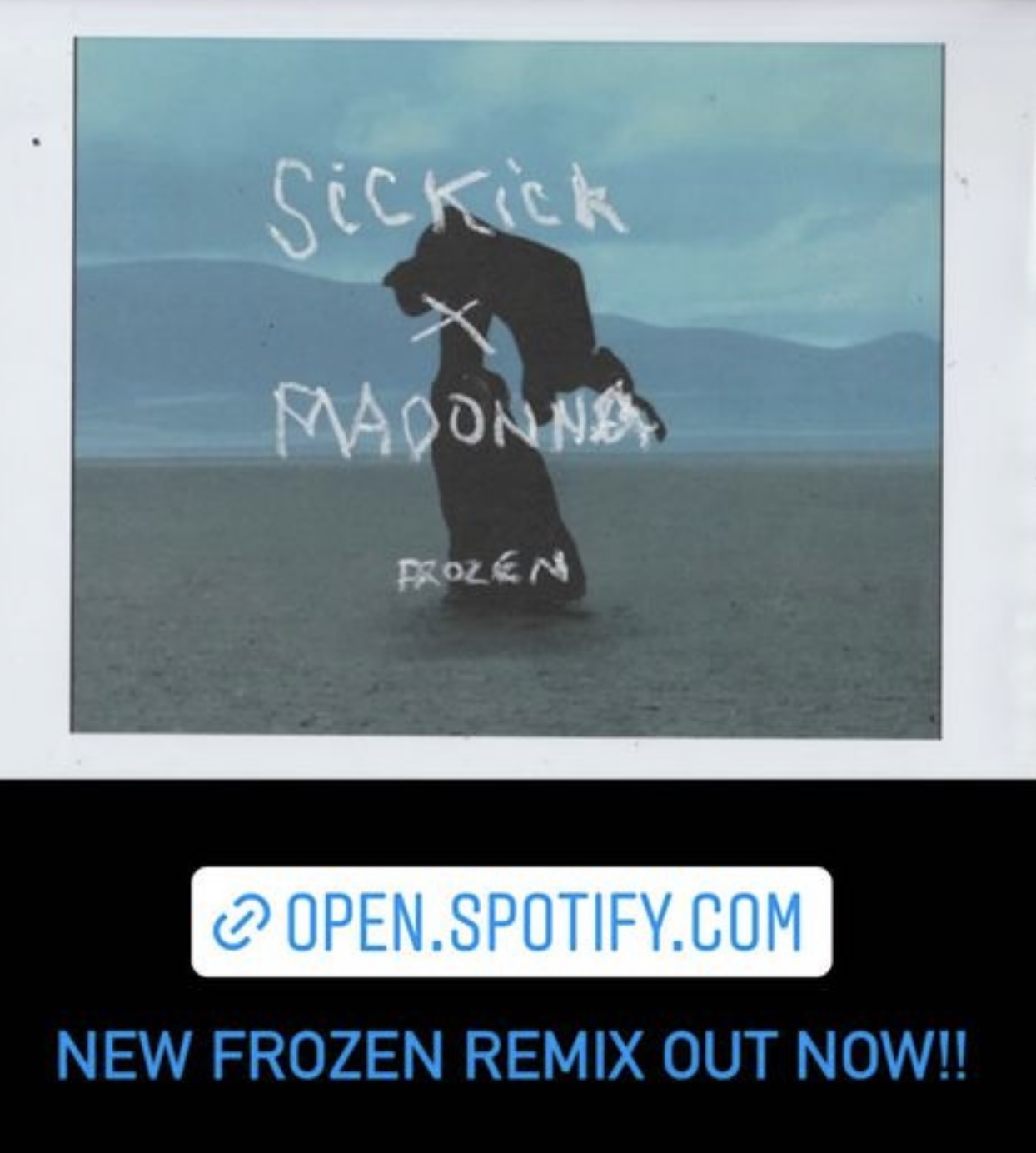 Es de allí mismo, de la plataforma tiktok, que el remix realizado del single “Frozen” de Madonna comenzó a hacerse conocido, tanto que hasta la propia cantante lo tomó como una versión oficial subiéndolo a sus redes. El track consta de tan solo 2:01 minutos y se basa en un loop del estribillo de la canción. Sickick ha comentado que la intención de la canción era servir como teaser o adelanto de una nuevo colaboración completa con la Reina del Pop. Por el momento “Frozen” (Madonna vs. Sickick Remix) es un éxito en los charts digitales: TOP50 en el Itunes US (su primera canción en lograr esta meta luego de “Medellin”), sigue en el puesto N°23 del WorldWide Itunes Chart y con más de 100 mil reproducciones diarias en Spotify.