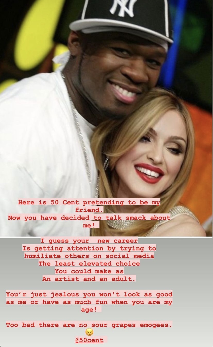 Al día siguiente, Madonna subió una story a Instagram en donde la veíamos abrazada al rapero y con un texto respondiendo las agresiones: “Aquí está 50 Cent con la intensión de ser mi amigo. ¡Ahora has decidido hablar mal de mi! Supongo que tratas de llamar la atención en tu carrera humillando a otros en las redes sociales. La elección menos elevada que podrías hacer como artista y como adulto. Estás celoso de que no te verás tan bien ni te divertirás tanto como yo cuando tengas mi edad. Lástima que no existe un emoji de uva amarga”. Luego de este descargo por parte de la diva, inmediatamente 50 cent quiso responderle a través de Twitter: “Debo haber herido los sentimientos de Madonna, ella puso una vieja foto de MTV del 2003. Ok, lo siento, no tenía intensión de herir tus sentimientos. No me beneficio con esto de ninguna manera. Dije lo que pensé cuando vi la imagen. Espero que aceptes mis disculpas”.