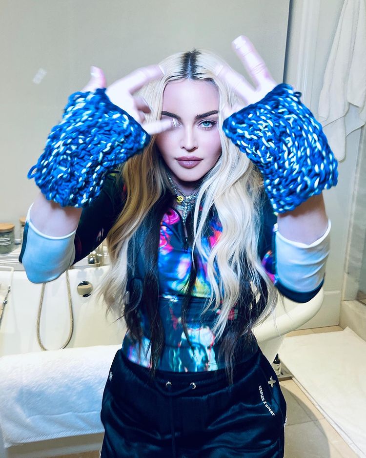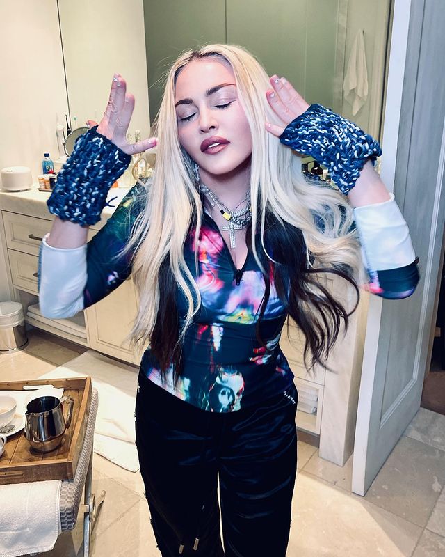 Madonna se mostró de muy buen humor luciendo los guantes de lana que su hija Estere le había tejido para la Navidad: «Estere tejió mis guantes para Navidad. Pueden ver lo orgullosa que estoy?».