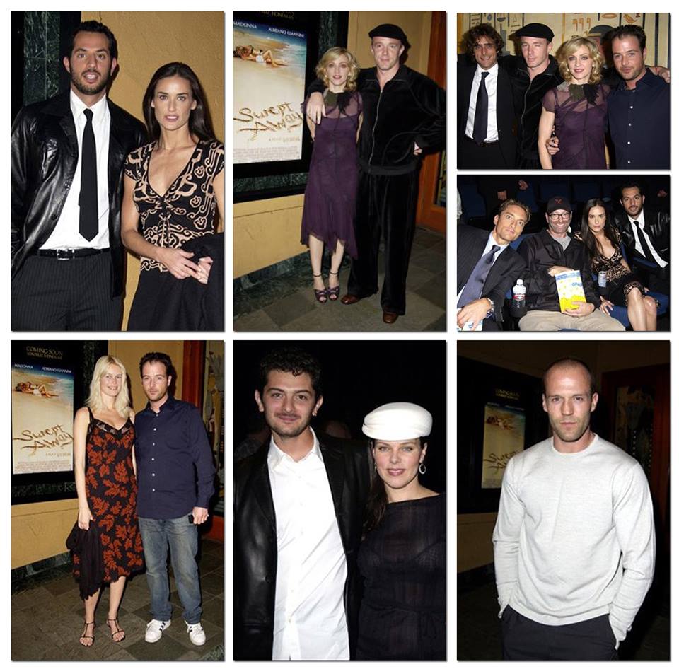 El 07 de octubre de 2002, Madonna asistió a la premiere de su pelicula «Swept Away» en el «Vista Theater» en Los Ángeles. Familia y amigos estuvieron con ella en el estreno: Donna deLory y Niki Haris, Guy Oseary, Demi Moore, Claudia Schiffer, Matthew Vaughn, Debi Mazar, Herb Ritts, Joe Henry, Jason Statham y la hermana de Madonna, Melanie Ciccone, entre otros. Madonna lució un vestido cerrado color violeta mientras que su esposo, el director Ritchie, se mostró con un conjunto deportivo de terciopelo negro y boina.