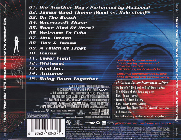 El soundtrak del film estuvo compuesto por David Arnold para Warner Bros. Records; incluye 15 canciones realizadas especialmente para la película, además de la canción «Die Another Day» compuesta y producida por Madonna y Mirwais Admahzai e interpretada por ella. «Die Another Day» fue lanzado como single principal del soundtrack el 10 de Octubre de 2002 y tuvo un gran éxito llegando a los primeros puestos en los rankings mundiales. Madonna también grabó el videoclip correspondiente inspirado en el film, dirigido por el grupo sueco Traktor. El CD del soundtrak incluye además, el video clip y el making of del mismo.