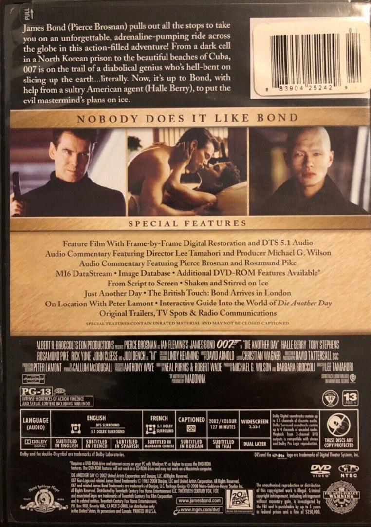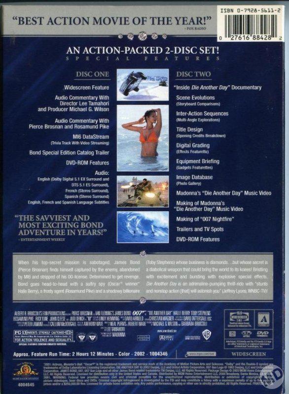 El film «Die Another Day» es otra película más que conforma la extensa lista de filmes de la saga James Bond. Esta vez, fue la película N°20 y la cuarta y última protagonizada por Pierce Brosnan como el mítico agente secreto. El film estuvo escrito por Neal Purvis y Robert Wade y dirigido por Lee Tamahori; contaba, además con las actuaciones de John Cleese, Samantha Bond y Halle Berry. «Die Another Day» se estrenó el 20 de Noviembre de 2002 en Londres con la presencia de la Reina Elizabeth II y el 22 de Noviembre en USA convirtiéndose en un éxito de taquilla de manera inmediata superando una recaudación de U$S 43.9 millones.