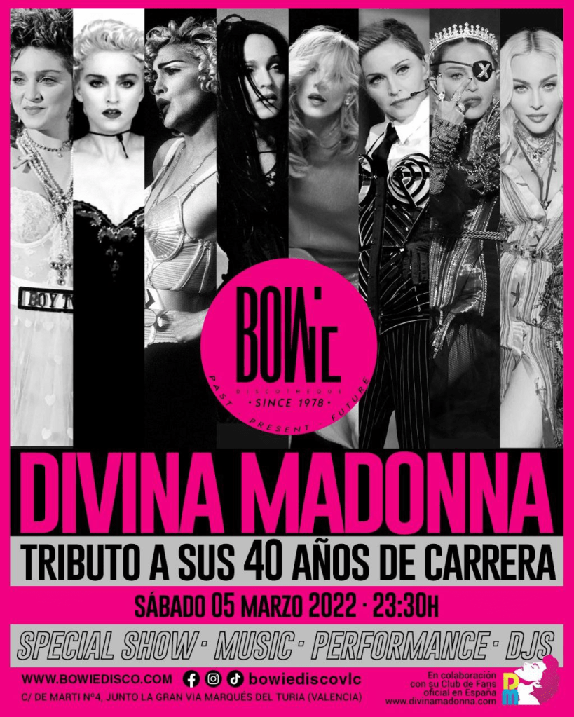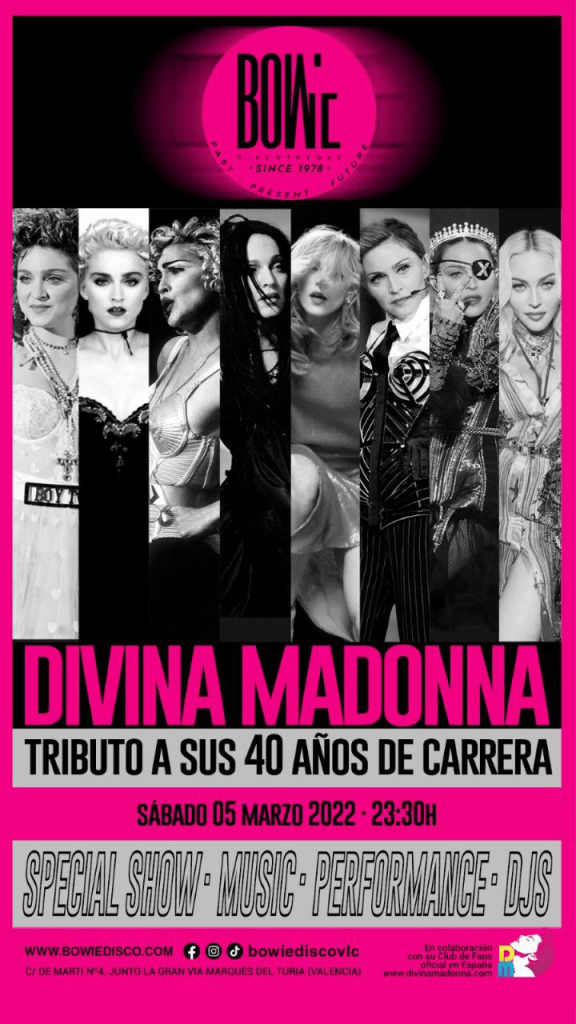 La sala Bowie se convierte en el huracán de la ambición rubia con un mega tributo a Madonna para celebrar sus 40 años en la música. Con la colaboración especial de «Divina Madonna», su club de Fans oficial en España, le rendiremos homenaje con un NONSTOP de sus hits, actuaciones, shows en directo, merchandising, photocalls y decoración. Un evento a la altura para demostrar porqué sigue siendo la única Reina del Pop.