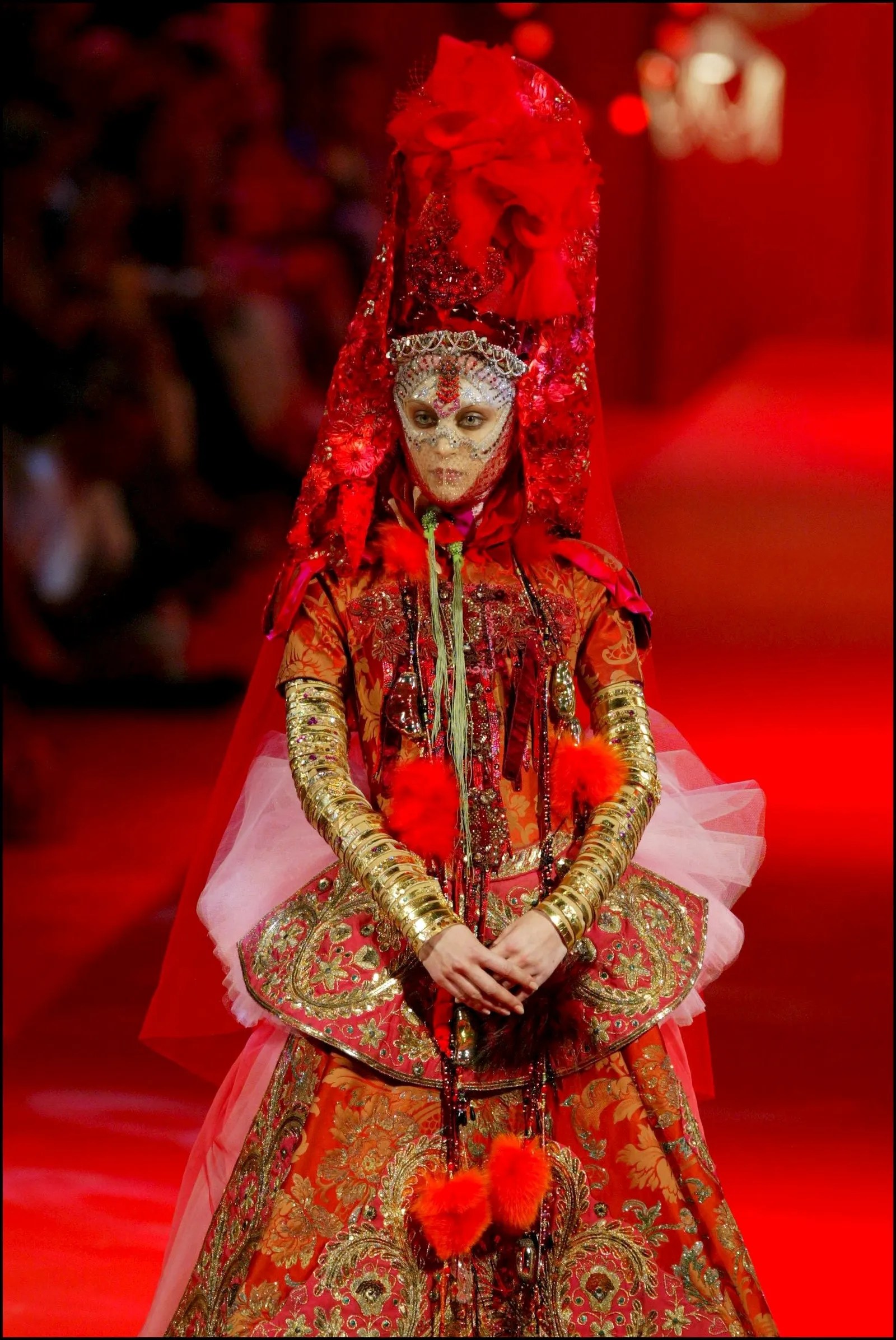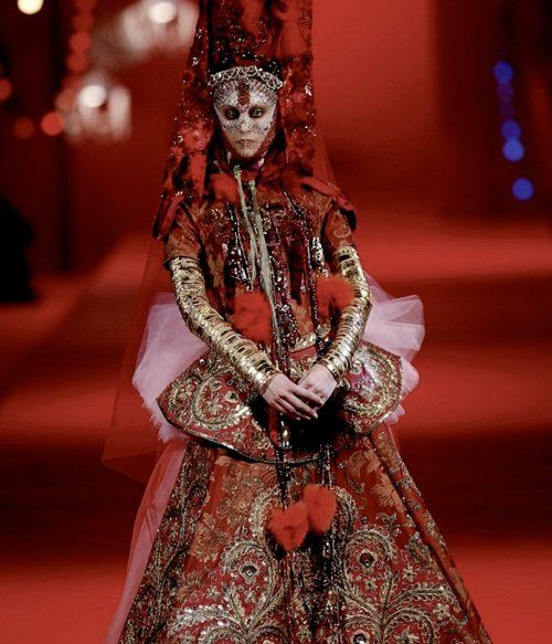 La prenda forma parte de la colección otoño-invierno 2002 de Lacroix y sirvió como cierre del desfile a modo de vestido de novia; una novia con vestido color rojo sangre y una máscara que cubría parcialmente su rostro era algo bastante innovador para entonces. Lacroix se inspiró para realizar esta colección en la cultura española y mexicana tomando como base los trajes de luces de los toreros y toda el estilo subrealista de la pintora Frida Khalo.
