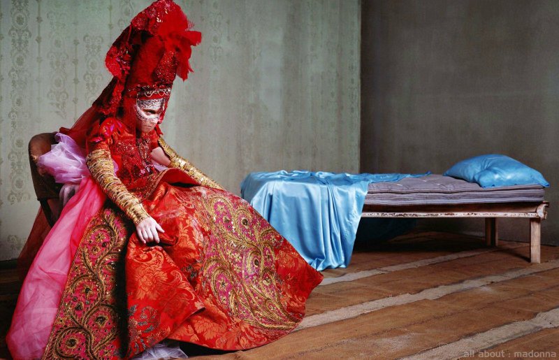 En esta sesión de fotos, se mostraba a Madonna interpretando a varios personajes en escenarios decadentes y oscuros y uno de esos personajes fue mencionado como «The Queen». Así vemos a Madonna luciendo un impactante vestido largo y abultado en color rojo acompañado de un gigantesco tocado y una máscara que le cubría el rostro. Estas fotografías fueron tan impactantes en lo que a estética respecta que fueron usadas luego como eje principal de la exhibición itinirante titulada «X-tatic Process» y en el libro del mismo nombre publicado a comienzos de 2003. Sin embargo, no fue hasta 2004 cuando este vestido se hizo más que famoso y comenzó a ser mencionado como una de las icónicas prendas lucidas por la Reina del Pop. La apertura de la gira «The Re-Invention Tour» consistía en un video con escenas y fragmentos de esta sesión de fotos, sobre todo, Madonna en su personaje de «The Queen» con el vestido rojo. El clip estaba musicalizado con la canción «The Beast Within» y desde ese momento, el video tomó forma y se impuso como un videoclip original (y con todo el derecho).