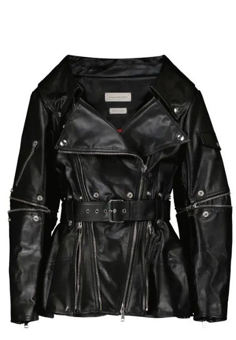 - Chaqueta de cuero negra cruzada con cinturon de Alexander McQueen.