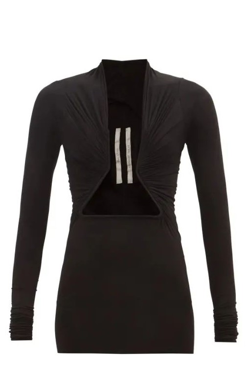- Vestido corto de jersey negro con pecho abierto y mangas largas modelo «Drkshdw» de la colección primavera-verano 2022 de Rick Owens.