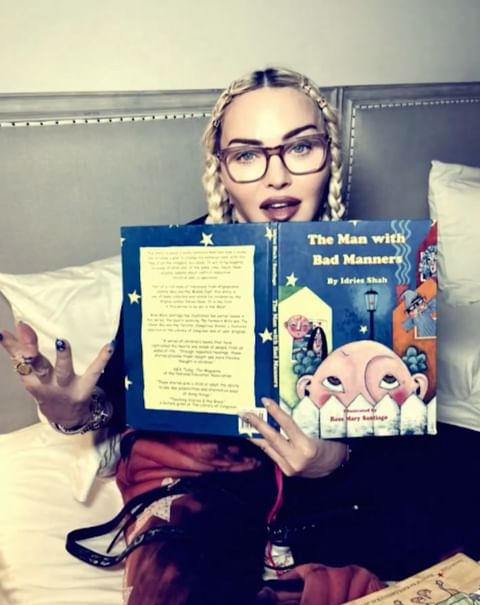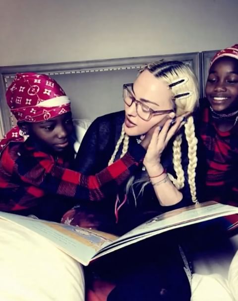 «Sunday Funday» comentó Madonna en su cuenta de Instagram mientras se la ve muy relajada en cama contando cuentos a sus niñas Estere y Stella.
