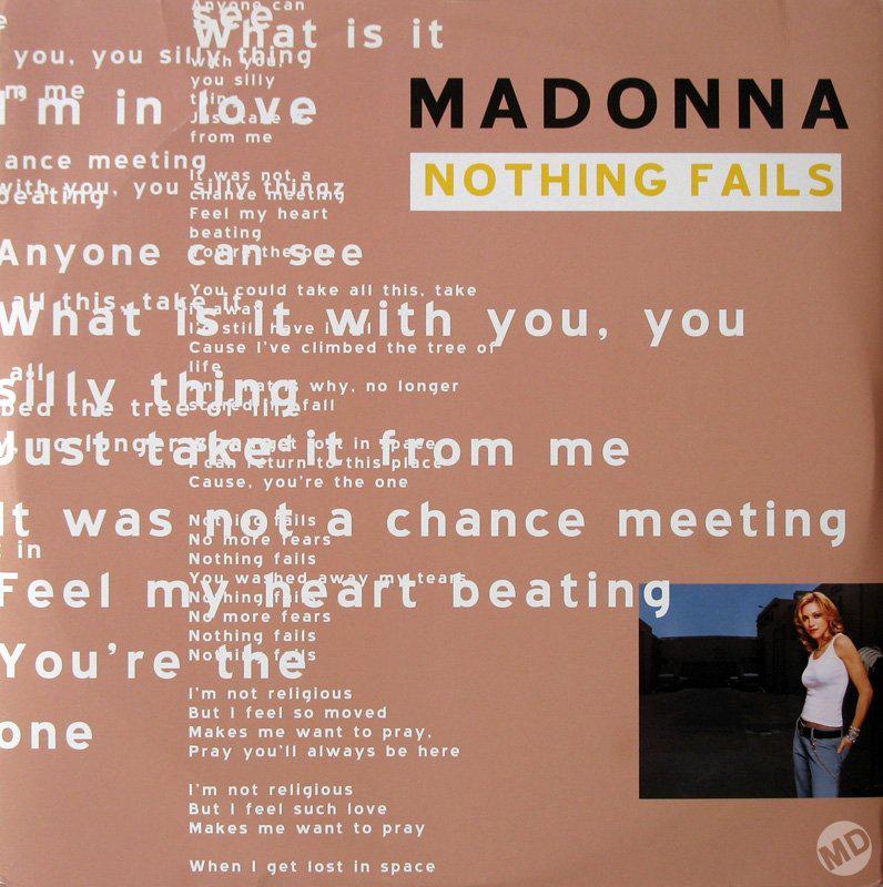 06 – «NOTHING FAILS» (04:49): canción de amor basada en el demo «Silly Thing» compuesta originalmente por Guy Sisgworth y Jem Griffiths con arreglos posteriores de Madonna y Mirwais. Esta canción fue el tercer single lanzado en Diciembre de 2003. Es considerada por muchos como una de las mejores canciones del disco y mencionada como una segunda parte de «Like a Prayer» ya que cuenta con la presencia del London Gospel Comunity Choir. Este single no tuvo videoclip y tampoco logró ingresar en el HOT100. Fue interpretada en vivo durante la gira promocional del disco y en el «The Re-Invention Tour» (2004). Lee el artículo aquí.